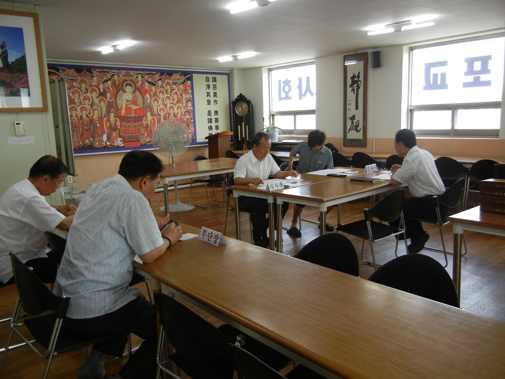 - [인천경기] 불기 2556년도 인천경기지역단 7차 운영위원회의가 8월 9일 저녁 7시 지역단 사무실에서 있었습니다. 이날 회의에서는 추경예산 승인의 건, 8재계 포상자 추천 심의의 건, 추계 체육대회 실시, 지역단 정기법회 실시등의 안건이 상정되어 진행되었습니다. 상반기 감사보고를 하고있는 인천경기지역단 법상 윤종범 감사 인천경기지역단 덕암 전문기단장의 인사말 치열한 토의가 논의되고 있는 운영위원회의 회의를 마치고 사홍선원으로 마무리 짓는 시간이었습니다.