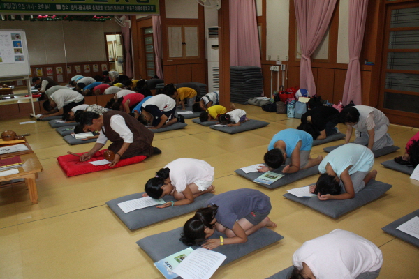 - [부산] 포교사단 부산지역단 계층포교 어린이 연꽃, 마야팀 법회 및 템플스테이 봉행 일자 : 불기 2556년 8월10일 오후 6시30분(집결) 장소 : 부산, 금정구 청룡동 소재 범어사 문화원 법당 어린이 연꽃팀 : (정도) 이상용 팀장 어린이 마야팀 : (환희야) 홍미혜 팀장 외 팀원 10영 (예비포교사 2명포함) 어린이 20명 참석 계층포교 어린이 연꽃, 마야팀 (정도) 이상용 팀장, (환희야) 홍미혜 팀장은 불기 2556년 8월120일 금정구 청룡동 범어사 문화원에서 어린이 법회 및 여름 하계 템플스테이를 봉행 하였다 이날모인 어린이 들은 오랫만에 부모곁을 떠나 1박2일동안 부처님 품안에서 직접 떡뽁이 요리를 하여 포교사 선생님들과 같이 저녁공양을 하였으며 포교사 선생님들의 따뜻한 지도아래 갖가지 준비한 일정표에 따라 법회 및 템플스테이를 봉행하였다 천진난만하고 놀기만 하던 어린이 들은 저녁 9시 20분 범어사 문화원 법당에 모여 부처님을 향한 삼배 및 삼귀의 봉송, 찬불가를 힘차게 부르며 , 한글반야심경봉독, 참회발원21배를 하였으며 , 합장한 두손에는 미래의 천진 불이 아닌가 생각하며 가슴뿌듯하게 느꼇었다 연꽃팀의 (정도) 이상용 포교사는 포교중에 어린이 포교가 가장 어렵고 힘든 포교라고 하였다, 그러나 어린이 포교에는 사명감이 없어서는 할수가 없어 포교사가 되고나면 부산불교 회관에서 운영하는 동련(어린이 포교 지도자 교육) 에 가입하여 1년의 정규 과정을 수료하여 연꽃 및마야팀의 팀원으로 활동을 시킨다고 한다 또한 어린이 모집에 대하여서도 매우 신중히 노력하지 않으면 도중에 하차하는 일이 번번히 생기므로 불자가족의 자녀라 하더라도 지도하는 선생들이 조금만 소흘이하거나 약속을 지키지않으면 어린이들을 통제하기가 어렵다고 한다 항상 관심과 보살핌으로 어린이 포교에 힘쓰겠지만 주위에서 많은 도움과 관심을 가져 주었으면 한다고 어려움을 예기하였다 힘들고 어려운 포교를 하시는 어린이 연꽃, 마야팀원들에게 부궁한 발전과 미래의 천진불들의 건강을 아울러 빌며 항상 부처님의 자비광명이 함께 하시기를 기원합니다 사진,글 : 홍보위원 (고불) 이 종 석 두손모음 어서 오십시요 여기가 범어사 문화원 입니다 어린이들이 직접 요리한 떡뽁이를 포교사 선생님들과 함께 공양을 하고있는 모습입니다 범어사 문화원 법당 입니다, 템플스테이 일정표 천진난만하던 어린이 들이 부처님전에 합장하고 삼배를 올리고 있다 큰절하는 모습이 너무 아름답네요 미래의 천진 불 들입니다 또박또박 독송하는 한글반야심경 연꽃팀의 (정도) 이상용 포교사의 집전 마야팀의 (환희야) 홍미혜 팀장이 어린 소녀불자와 함께 어린이 법요집을 들고 한글반야심경을 독송하고 있다 참회발원21배는 시작되고 시간은 밤 9시 40분을 향해 가는데 포교사 선생님들과 어린이 불자들은 정해진 일정표를 따라 수행을 봉행하고 있었다 이 장엄하고 아름다운 분위기를 깨칠수 없어 부처님께 합장하고 조용히 물러나와 아름다운 회향을 하였다 부디 건강한 무습으로 어린이 하계 법회 및 템플스테이가 잘 봉행되기를 기원해 본다 포교사단 부산지역단 홍보위원 : (고불) 이 종 석 합장