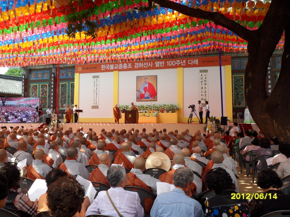 - [서울] 한국불교 중흥조 경허 대선사 열반 100주년 추모 다례 한국불교중흥조 경허선사 열반 100주년 다례 봉행위원회, 대한불교조계종 제 7교구본사 덕숭총림 수덕사가 주최하고 경허선사 열반100주년 기념사업회가 주관, 대한불교 조계종 총무원이 후원한 경허 대선사 열반 100주년 추모 다례가 불기2556년 6월14일 목요일 오후2시 조계사 대웅전에서 봉행되었다. 육법공양, 삼귀의례, 반야심경 봉독, 조계종 원로의원 월탄 대종사의 경허 선사 행장소개, 총무원장 자승 스님의 추도사, 종정 진제 대종사 법어, 종사영반, 문도대표 인사 등 순으로 진행된 이날 행사에는 총무원장 자승스님, 교육원장 현응스님, 포교원장 지원스님과 보선스님등 많은 스님들과 1000여명의 사부대중이 참석했으며 특히 대한불교조계종 서울지역단 계영석 단장과 서울지역단의 100여명이 넘는 포교사와 대전충남지역단의 강종효 단장과 50여명의 포교사가 참석하여 봉사하였다. 경허대선사는 1846년 8월 24일 전주 자동리에서 부친 송두옥과 모친 밀양박씨의 차남으로 출생하신 한국불교 중흥조 경허선사께서는 속성은 송씨 이름은 동욱, 법명은 성우이며, 법호는 경허. 1854년 (모친 박씨를 따라 지금의 경기도 의왕시 청계사에서) 계허스님을 은사로 출가 사미계를 수지. (1859년 14세 때 청계사에서 박선비가 경허선사의 비범함을 알아보고 “훗날 반드시 큰 그릇이 되어 일체중생의 스승이 되겠구나” 예언을 했다. 청계사를 떠나 동학사 강사 만화보선의 문화에서 경학을 수업하기 시작함.) 1860년부터 1868년까지 동학사 강원에서 내외전을 두루 섭렵 팔도에 이름을 떨쳤으며 선사께서는 불경뿐만 아니라 유가와 노장의 전적들까지도 완벽하게 꿰뚫으셨다. 1879년 6월 환속한 스승 계허를 만나기 위해 상경하던 중 천안근처에서 창궐한 콜레라로 죽어가는 중생들을 보고 “일체 세간이 모두 꿈속에서 바라보던 경치에 지나지 않음을 ”알고 동학사로 돌아와 강원을 폐지한 후 방문을 닫아걸고 “여사미거 마사도래”의 화두를 참구. 선사께서는 다리를 찌르고 머리를 부딪쳐서 수마를 쫓으며 필사적으로 정진했으나 은산 철벽에 부딪치셨으나 그해 11월15일 “우무비공처라는 말을 듣고 확철대오 . 1880년 지금 충남 서산시 고북면 천장암에 보림 후 오도송. 홀연히 고삐 뚫을 곳이 없다는 사람의 소리를 듣고 몰록 깨닫고 보니 삼천대천세계가 나의 집이네 유월 연암사 아랫길에 일없는 들사람이 태평가를 부르네. 1882년부터 1898년까지 선사께서는 충청도와 경상도 일대의 절인 동학사, 서산부석사, 마곡사, 장곡사, 보석사, 예천 용문사, 대전 묘각사, 사불산 대승사, 문경봉암사 등지에 주석하시며 선풍을 진작하셨으며 또한 수월, 침운, 혜월, 만공 등을 제자로 받아들이고 지도를 하셨다. 1898년 충남 서산 부석사에 주석하시던 선사께서는 동래 범어사 계명암의 초청을 받아 제자인 만공, 침운과 함께 영남 최초의 선원을 개설 하안거를 지도 하셨으며 그해 겨울 청암사 수도암에서 금강경을 강의 하다 제자 한암중원을 만나셨다. 1899년 가야산 해인사로 주석처를 옮기신 후 고종의 칙명으로 대장경을 인출하는 불사와 수선사를 설치하는 불사의 법주로 추대되어 수선사를 창설하고 상당법어를 하셨으며 또한 (해인사수선사방함인) (합천군가야산해인사수선사창건기) (결동수정혜동생도솔동성불과계사문)등의 글을 남기셨다. 1900년부터 1903년까지 선사께서는 해인사 범어사를 비롯한 경상일대의 사찰 뿐 만 아니라 송광사, 태안사, 화엄사, 지리산, 천은사, 영원사, 실상사 등 남도의 사찰들을 둘러보며 선사들의 영찬을 써주셨을 뿐만 아니라 선원도 개설하셨다. 1903년 범어사에서 (선문촬요)의 원형이 되는 (정법안장)을 편찬하고 (정법안장서)를 완성하셨으며 1904년 천장암에 들러 제자 만공월면스님을 인가하고 전법게를 내린 후 삼수갑산으로 길을 떠나셨다. 1905년 강원도 월정사에 머물며 3개월간 화엄경을 강의했고 1906년 안변 석왕사에서 나한개분불사 증명을 하셨다. 1906년부터 1912년까지 평안북도 강계, 위원, 함경남도 삼수, 갑산, 희천 등지에서 박난주로 이름을 지은 뒤 머리를 기르고 선비의 갓을 쓰고 서당의 훈장을 하며 아이들을 가르쳤으며 당시 신지식인이며 독립 운동가들이였던 김탁, 김수장등과 함께 민족의 앞날을 고민하셨다. 1912년, 4월25일, 선사께서는 함경남도 갑산군 웅이방 도하동에서 남긴 임종계.. 외로이 홀로 밝은 마음의 달 온누리의 빛을 머금었구나 그 달빛 온 누리와 함께 사라졌으니 이는 다시 무엇인가 취재 남부총괄팀장 한애경 법용화