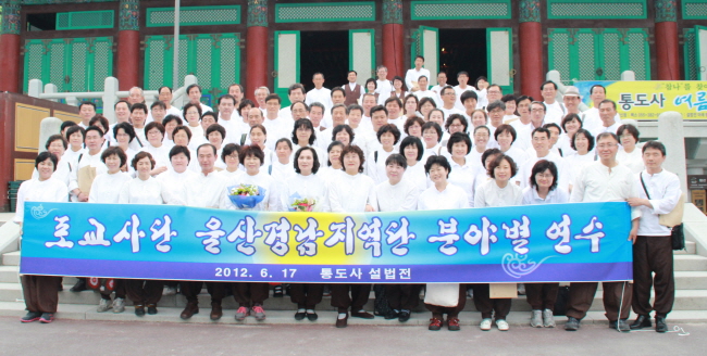 - [경남] 울산경남지역단(선행심 이문자 단장)은 불기 2556년 6월 17일(일) 제15교구본사 통도사에서 분야별 연수교육 및 6월 정기운영위원회를 실시했다. 이날 연수교육은 1부 삼귀의, 한글반야심경, 포교사의 노래, 포교사의 다짐, 지역단장 인사말, 표창수여, 통도사 주지 원산 스님 법문, 분야별 (사찰문화, 군포교, 염불봉사) 사례발표, 2부 6월 울산경남지역단 운영위원회를 성원보고, 단장 인사, 전월 회의 결과 보고, 회무보고, 재무보고, 안건심의, 공지사항으로 진행되었으며, 3부 분야별 활동 평가, 통도사 포교국장 반산 스님 특강, 공동목표 찾기 분야별 (팀별) 그룹토론 및 토론 결과발표, 공지사항, 사홍서원에 이어 기념촬영 후 행사를 원만하게 회향 했다. ♣사진/글 : 덕산 이승선♣ ♣포교사단 울산경남지역단 자원봉사 행원팀 홍보위원♣ ♣E-Mail : lss5464@hanmail.net♣