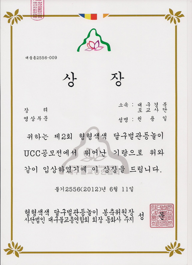 - [대구] 지난 6월11일 대구 동구에 위치한 문화웨딩 1층홀에서 대구불교총연합회의 불기2556년 부처님 오신날 연등회행사 평가회 행사가 열렸습니다 이날 행사중 가진 연등회 행사 UCC공모전 시상식에서 대구경북지역단 홍보팀(팀장 운산 권용일)에서 출품한 동영상이 동영상 부문 장려상을 수상하였으며 사진부문에서도 홍보팀의 법계성 노영이 포교사가 장려상을 수상하였습니다. 이는 5월 한달간 대구 경산 영천지역의 점등식과 봉축행사를 동참취재하느라 바쁜 가운데서도 함께 모여 출품을 위해 애써준 홍보팀원들의 단합된 노력의 결과라 생각되며 모든 포교사님과 함께 축하드립니다 .