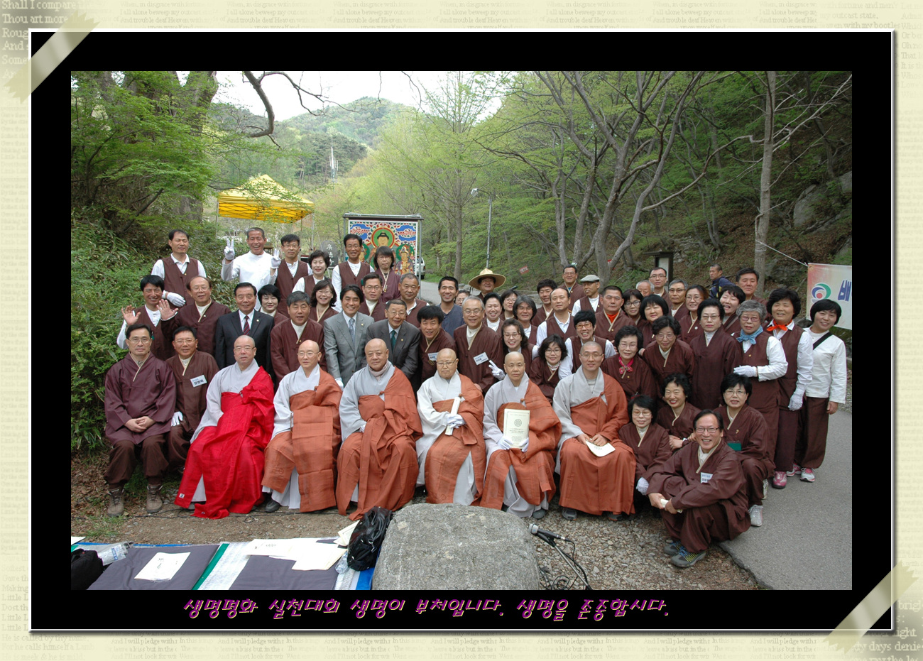 - [대전충남] 대전충남 포교사단(단장 강종효)이 주최를 하고 충남 총괄팀(팀장 정광성)이 주관을 한 제 1회 생명나눔실천 포교전진대회가 29일 천안 광덕산 광덕사 앞마당에서 봉행되었다. 천안 사암연합회 회장 대원스님(각원사 주지)과 광덕사 회주이신 철웅스님 수덕사 포교국장 정경스님을 비롯하여 10여명의 지역 스님들이 동참하였으며, 임희웅 포교사단 중앙단장과 계영석 서울단장, 김혜작 충북단장 등 포교사단 지역단장과 대전충남 포교사 150여명이 참석하였다. ‘생명이 곧 부처입니다. 생명을 존중합시다’ 라는 슬러건 아래 펼쳐진 생명평화실천캠페인은 부처님의 생명평화 가르침에 따라 환경파괴의 심각성을 제기하고 생명존중사상을 광덕산과 광덕사를 찾는 대중들에게 홍포하여 학원폭력과 환경파괴 등을 예방하기 위한 실천 활동으로 기획됐다. 강종효 대전충남지단장은 봉행사를 통하여 “인간은 사회적 동물로 나 혼자만이 살 수 없음을 말하며, 인연법에 의해 다른 매개체와 어울리며 더불어 살아야 한다는 뜻으로 알고 있다.” 며 “더불어 산다는 것은 혼자는 살 수 없다는 뜻으로, 이 세상의 모든 생명이 어느 것 하나 독자적으로 태어난 것은 없으며, 또한 나와 무관한 것이 없으므로 생명을 존중해야 한다.” 본 대회의 취지를 밝혔다. 임희웅 중앙단장은 축사를 통하여 “포교사단이 출범한지 12주년을 맞이했는데 지역 단에서 종단에서 실시하고 있는 종책을 가장 앞서서 실천하는 단이 대전 충청 지역 단이라.” 며 “광덕사 앞마당에서 펼치는 생명존중 캠페인은 부처님께서 말씀하신 모든 생명은 차별 없이 위도 없고 아래도 없는 생명존중과 평화를 실천하는 의미에서 매우 뜻 깊은 행사로 전국 포교사단으로 대회가 확산되기를 바란다.” 하였다. 천안 사암연합회회장 대원스님은 “오늘의 생명 나눔 실천대회는 나를 살리고 모든 자연을 살리는 큰 부처님의 자비실천이 이루어지는 것으로, 광덕산에서 머무르지 말고 더욱더 확산되어 전국의 포교사단에서 실천하는 대회로 발전해 나가기를 바란다.” 하였다. 또한 대원스님은 “우리 모두는 자연의 일부분으로 저마다의 가치와 역할을 가져야 한다.” 며 부처님의 말씀을 실천하고 이웃의 아픔을 소중히 여기는 불자가 되기를 바란다 하였다. 대전충청 포교사단에서 실시한 생명 나눔 실천대회는 환경보호 차원에서 광덕산 일원에서 잡초 및 쓰레기 수거 운동을 펼쳤으며, 광덕산을 찾는 등산객을 상대로 단주와 떡을 나눠주며생명존중 사상을 일깨워 주었으며 108배를 통하여 생명의 아픔을 함께 나누는 참회운동을 펼쳤다. 대전충남 포교사단에서 실시하는 생명나눔평화실천대회는 광덕산 대회을 시작으로 하반기에는 대전의 계족산등 대중이 함께 하는 곳을 찾아가 일회성이 아닌 지속성을 갖고 운동을 펼처나가기로 했다.