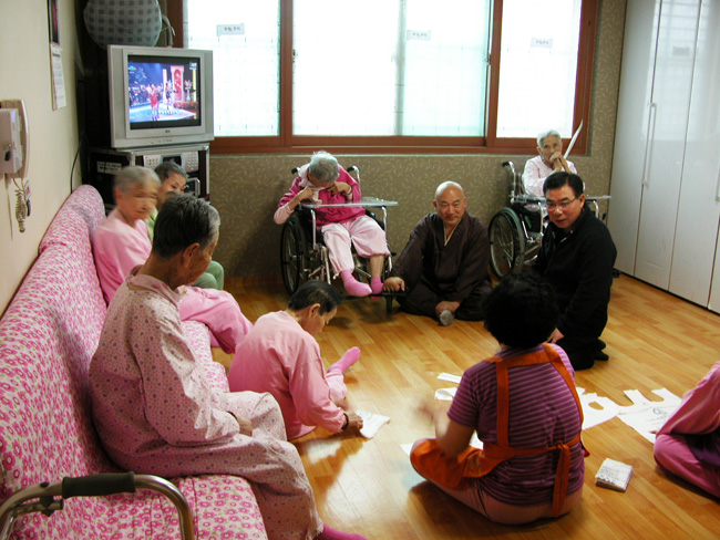 - [서울] 포교사단 서울지역단 북부지역 지역봉사2팀은 불기2556년 4월 21일 10:00~14:00까지 사회복지법인 수효사 효림원을 찾아 봉사활동을 하였다. 이날은 북부지역 지역봉사2팀에서 처음으로 지역봉사활동을 하는 날로, 계영석 단장과 정청현, 고미애 부단장, 이명숙 총괄팀장, 정면 선거관리위원이 격려차 참석하였으며, 박윤재 팀장과 이재상, 박정애, 김종문, 김정숙 포교사가 어르신들의 말벗해드리기와 박수치기, 식사도와드리기, 대청소 등을 하며 뜻 깊은 시간을 보냈다. 계영석 서울지역단장은 격려차 이 자리에 참여하였으나, 양말까지 벗어젖히고 방바닥을 비누청소하며 구슬땀을 흘리면서도 시종일관 미소를 잃지 않으면서 지역봉사2팀에서 보람 있는 활동을 하게 되었다며 즐거워하였다. 모든 봉사활동이 끝난 시간에는 거실의 노래방 기기를 이용하여 박윤재 북부지역 지역봉사2팀장을 시작으로 어르신들게 노래를 불러드렸다. 박윤재 팀장은 서툰 노래실력이지만 어르신들게 음성공양을 올린다는 마음가짐으로 정성스럽게 노래를 불렀는데, 그 모습이 무척이나 아름다웠다. 사회복지법인 수효사 효림원은 2004년 김동금(무구)스님에 의하여 설립된 노인요양시설로, 고령화사회에서 경로효친사상을 바탕으로 어르신들의 편안하고 행복한 노후를 보내시도록 하고, 부천님 참 뜻을 실천하는 선진 복지사회를 구현하는데 목적을 둔 요양원이다. 효림원에서 생활하는 어르신들은 1등급에서 3등급의 요양등급을 판정받은 분들로, 거동과 언어 등, 많은 보호의 손길을 필요로 하시는 분들이다. 현제 효림원에 머물고 계시는 어르신은 25분으로, 개인이 1/3의 이용비용을 지불하고 의료보험관리공단에서 2/3의 비용을 지불하는 혜택을 누리고 있다. 북부지역 지역봉사2팀은 매달 셋째주 토요일 10:00~14:00까지 이곳 효림원에서 지속적인봉사활동을 가지게 된다. 하루 종일 지루한 일과를 보내던 어르신들은 포교사들의 방문에 무척 즐거워하며 언제 또 올 수 있느냐며 헤어짐을 아쉬워했다. 계영석 단장은 서울지역단이 올해부터 지역총괄제를 실시하게 되었는데, 지역총괄제의 성패는 지역봉사팀들의 활성화 여부에 달려있다고 말하며, 다른 지역봉사팀에서도 적절하고 의미 있는 활동장소를 발굴하여 지속적인 팀활동을 하여야 할 것이라고 말했다. 사진 : 정면(서울 선거관리위원)