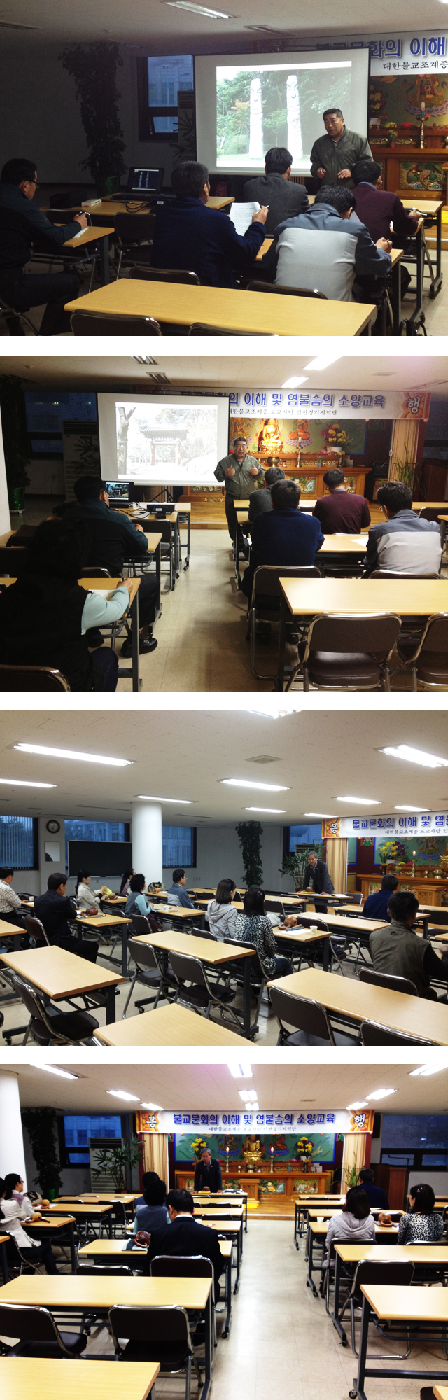 - [광주전남] 광주전남지역단에서는 지난 4월 2일부터 매주 월요일 지역단 사무실에서 저녁 7시부터 9시까지 염불봉사팀원들을 상대로 목탁교육을 실시하고 있다 이번 교육은 매년 실시해 오고 있는 목탁교육의 일환으로 금년에도 염불봉사팀에서 마련하였으며, 이후 5월중에는 금번 1차합격자를 상대로 매주 목요일 실시하며, 6월 말까지 8회에 걸쳐 실시하고자 한다. 목탁교육은 현재 염불봉사팀장을 맡고 있는, 문수행 조현옥 포교사가 전임 팀장 보문 전상길포교사와 함께 실시하고 있으며, 1차 합격자에 대해서도 이어서 교육을 담당하고자 한다 이번 목탁교육은 조문염불을 시작으로 천수경,거불,장엄염불,금강경,반야심경 까지, 염불봉사 시 주로 활용하는 불경 위주로 실시하고 있다. 지역단의 염불봉사팀은 전 단원이 염불종사 시에, 집전을 할 수 있도록, 기존 단원은 물론 신임 단원들에 대하여 매년 목탁교육을 하고 있다. 이와 같은 교육의 성과에 힘입어 염불봉사나 각종 불교관련 행사 시에, 포교사들이 직접 집전을 하고 있다. 지난 해 부처님 오신날 광주지역 제등행진 행사에도, 우리 단의 포교사가 집전을 하고, 빛고을아카데미 같은 큰 행사에도 포교사들이 집전을 하였다 처음 포교사들이 집전하는 것에 대해 일부 스님들이 이를 탐탁스럽게 여기지 않아, 목탁을 잡는 자체가 조심스러웠는데, 이제는 스님들 주관의 행사에도 자연스럽게 포교사가 집전을 하고 있으니, 그만큼 포교사의 활동 영역이나 위상이 달라짐을 느낄 수 있다