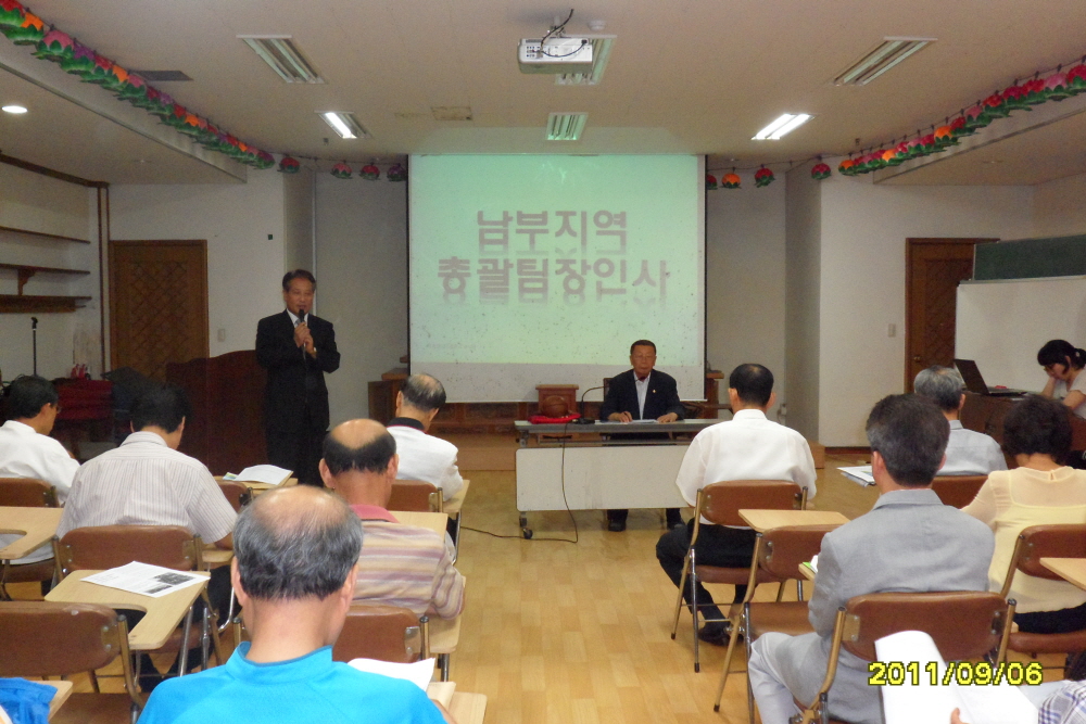 - [서울] 불기 2555년 9월 6일 화요일 오후 6시 대한불교조계종 포교사단 교육관에서 서울지역단 남부지역 총괄팀 회의가 개최되었다. 계영석 부단장의 사회로 진행된 이날 회의는 삼귀의례와 반야심경봉독, 포교사의 노래, 단장 인사말로 이어졌다. 포교사단 임희웅 단장은 인사말에서 11일 간 하루도 빠지지 않고 줄기차게 비가 내린 것은 50년만의 처음있는 일로 기록이 될 정도로 강우량이 예년에 비해 그 배가 넘었던 지루하고 긴 장마가 끝나고 벌써 추석이 됐다고 말씀하시며 장마로 인해 비 피해는 없었는지 물으시고 이어서 총괄팀 체제의 새로운 출범에 대한 설명과 함께 본격적인 회의 진행으로 이어졌다. 박상록 남부지역 총괄팀장도 이 자리에서 총괄팀 체제의 새로운 포부와 함께 모든 남부지역의 포교사님들께서 합심해서 열심히 포교하자는 당부의 말씀도 잊지 않았다. 이어서 임희웅 단장의 서울지역단 조직개편에 관한 사항에 대한 설명이 있었으며 안건과 함께 지역 총괄팀 활성화를 위한 방안과 제9회 8재계실천 대법회 일정에 대한 공지사항을 끝으로 모든 회의를 마쳤다. 남부 총괄팀 38명의 포교사가 참석한 가운데 열린 이날 회의는 사홍서원을 끝으로 모든 일정을 여법하게 끝마쳤다. 취재 기획팀장 한애경 법용화
