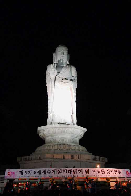 - [포교사단] 불기 2555년9월 24일 토요일 오후 6시 대한불교조계종 대구 팔공산 동화사 통일 대불전에 전국에서 불법(佛法)을 전하고 있는 2500여 조계종 포교사와 불자들이 모였다. 포교사단이 지난 2003년부터 재가불자의 지계실천 신행운동을 위해 개최하고 있는 8재계 수계실천대법회는 하루 24시간 계를 지키며 수행하는 출가자의 모습으로 정진한다. 8재계는 팔관재계(八關齋戒)의 줄임말로 재가불자들이 하루 밤낮동안출가수행자와 같은 계율을 받아 지니고 수행하는데서 유래했다. 8재계는 1.살생하지 않기 2.남의 물건을 훔치지 않기 3.음행을 하지 않기 4.거짓말 하지 않기 5.술 마시지 않기의 5계에 6.높고 편안한 침대에 눕지 않기 7.보석 등으로 몸을 꾸미지 않기 8.노래나 춤을 즐기거나 익히지 않기의 계율이다.이날 제5회 전문포교사 22명의 품수식과 16기 신규포교사 575명의 품수식이 거행되었으며16기포교사 575명은 6개월간 선배포교사함께 직접 포교 현장에서 포교를 몸으로 체험하였으며 불법을 전도하는 부르나 존자로 다시태어났다. 포교원장 혜총스님으로부터 포교사증 ,단복수여로 이어졌으며 전도선언문 낭독에서 “이제 중생들을 제도하기 위하여 나가라 그러나 같은 길을 두 사람이 함께 가지는 말아라. 한결같이 훌륭한 법문을 중생들에게 들려주고 언제나 깨끗한 수행자의 생활을 하라”는 말씀을 을 낭독했다. 이어서 전문포교사증.품수증수여 .전문포교사 결의문낭독.청법가.삼배.법어 .축가.사홍서원 으로진행되었다 포교원장 혜총 스님은 법어를 통하여 “불법은 확실히 깨치는것이중요하며 맹신하면 안된다. 8재계를 잘받아서 지키는것이중요하다.집도 오래되면 수리해야 거주하여살아갈수있는 것과 같이 계율도 마음가짐을 새롭게 하기위하여 매번 받아야한다.계율은 불교의 첫걸음이자 마지막이며 계율을 지키는 사람은 청정하다.수처작주하고 무소유하고 아낌없이 이웃에게 베풀있는것 그리고 부처가 되는것은 모든 중생들에게 나누어 주기위해서다. 이웃에게 베풀기위해서는 8재계를 마음속깊이 지니고 살아가는것이중요하다고 말씀하였다. 참가한 포교사들은 짧은 1박 2일 이었지만 도반들과 함께하여 밝은 마음과 불법을 이웃에게 전하는 포교사로서 다시 태어났다.글 기획팀 용담 왕영만 홍보위원 사진취재 기획팀장 한애경 법용화