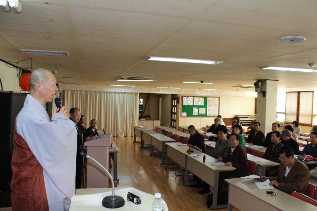 - [부산경남] 불기2555(2011)년 4월 23일(토) 13:00~16:00까지 화엄회관 (통도사부산포교원 불지사 2층)에서 대한불교조계종 포교사단 부산 ․ 경남 지역단에서는 포교원 포교국장 남전 스님을 모시고 포교사 고시 1차합격자 4월 정기 연수교육을 여법하게 봉행 하였다. 대한불교조계종 포교원 포교국장 남전 스님은 불교 정체성을 확보하기 위해서는 “삼귀의(계) 오계, 부처님 생애, 보시” 를 몸소 실천해야 한다고 했으며, “소통, 참여, 주체”에 대해 강의하신 후 재적사찰 중심 활동 강화를 하기 위해서는 제도적 마련이 필요하고 강조했고, 제14교구본사 범어사 포교국장 법귀 스님은 포교사가 갖추어야 할 자세와 종단과 승가 화합을 하기 위해서는 지도자가 될 여러분들의 많은 노력이 필요하다고 하셨으며, 이어서 부산 ․ 경남 지역단장(일행 심재덕)은 포교사가 되면 어떤 삶을 살아야 하는가 5가지 비유를 말씀하시면서, 부처님의 정법을 전하는 진정한 포교사가 되기 위해서는 “몸소 실천하는 행의 중요함을 강조, 매 순간마다 최선을 다하고, 찰라마다 기쁜 마음으로 초발심 정신으로 정진해야 진정한 포교사가 될 수 있다”고 하셨습니다. 공지사항으로 포교사고시 1차 합격자 전원은 흰색 상의 착용 불기2555(2011년) 5월 7일(토) 13:30까지 부산광역시 서구 동대신동 구덕운동장에 집결 부처님 오신날 제등행렬 행사 참여 봉사활동은 연수교육의 연장이라고 하시면서 포교사고시 1차 합격자 연수교육을 원만하게 회향했다. 사진/글 : 이승선 부산경남지역단 자원봉사 행원팀/ 포교사단 홍보위원