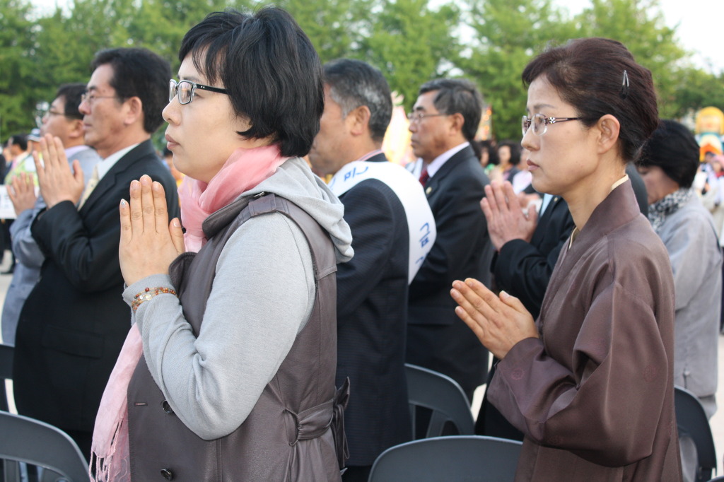 - [충북] 함께하는 나눔 실천하는 수행 대한불교조계종 제5교구 본사 속리산 법주사 봉축 법요식이 불기 2555년 5월 10일 오전 11시 법주사 대웅보전 앞에서 봉행되었다 명종 28타 개회식 - 삼귀의례 반야심경 사시예불 시작할 때까지도 비가 내려 대웅전에 행사 준비를 별도로 했는데 비가 멈춰 대웅전 앞 보리수 나무 아래 준비된 행사장에서 진행하였다 비가 멈춘 산사는 연초록의 색감이 더없이 예쁘게 빛나고 가녀린 잎파리들의 몸짓이 부처님 오신 날 축복 그 자체였다 부처님 전 헌화 시상식 포교사단 충북지역단 안병옥 단장님이 총무원장상을 받았다 감사패, 봉사상,공로상,장학금 전달,백일장수여 각 분야 수상자와 노현주지스님 기념 촬영 대한불교 조계종 제5교구 본사 법주사 주지 법기 노현스님 봉축사 이시종 충청북도 지사 축사 이기용 충청북도 교육감 축사 법을 청하는 청법가 비가 온 덕에 대웅전 뜨락에 작은 연못이 생기고 그곳에 연등의 반영이 아름답다 대한불교조계종 총지선원 선덕 함주스님 법어 마음은 부처를 빚어내는 진리의 원천이요 번뇌는 중생과 부처를 분별하는 근본이다 발원문 봉독을 하는 충북지역단 안병옥 단장님 덕 높으신 부처님 오심을 일심으로 찬탄 봉축 법요식 끝나고 관불의식 천상천하 유아독존 두 군데에 마련 된 아기 부처님 관불을 위해 사부대중 줄서서 기다리다가 정성껏 담은 한줄기 흐르는 물에서 하늘 아래 내가 존귀함을 깨닫는다 궂은 날이지만 부처님 오신 날을 봉축하기 위해 산사를 찾은 많은 불자들 비빔밥 한그릇과 떡 한봉지면 그 이상도 그 이하도 아닌 만인이 평등한 모두의 생일 날이 된다 방에 들어갈 수 없어 툇마루면 어떻고 흙마당이면 어떠랴 부처님 오신 날은 좋은 날 모두가 행복한 날이다 지역단 발전을 위해 늘 애쓰시는 안병옥 단장님 축하합니다 모두 성불 하세요 ()()()