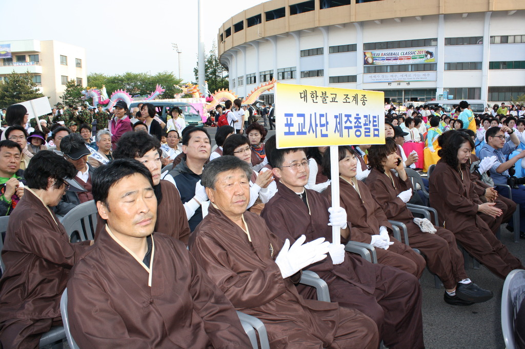 - [제주] 불기2555년 5월7일(토요일) 저녁6시 부처님오신날을 봉축하는 연합봉축대법회가 제주시 종합경기장 야외주차장에서 봉행되었다. 이날 제주특별자치도지사, 강창일 국회의원, 대덕 스님들과 포교사단 제주직할팀 포교사님들 비롯 각종단의 신도 약3천여명이 참가한 이날 대법회는 개회식, 육법공양, 삼귀의, 반야심경, 찬불가, 축원문, 봉축사, 축사, 법어, 기원문, 발원문순으로 진행, 국가의 안녕과 조국의 번영을 축원하고 부처님의 자비광명이 영원히 비추기를 기원했다. 이어 법어에서 웅산 원종스님(23교구본사 관음사 주지)은 “부처님의 자비와 보시를 통해 이웃에게 나눔과 베풀어 더불어 살아갈 것을 또한 세계는 전쟁과 기아등 자연 재앙등으로 삶의 질이 매우 낮아진 지금 불자형제 여러분들이 부처님의 자비와 보시를 통해 서로 도와야 한다”고 하였다 대법회에 이어 저녁7시30분부터 봉축행사의 절정을 이룬 종합경기장 ~ 서사라로타리 ~ 광양로타리 ~ 시민회관 ~ 남문로타리 ~ 중앙로타리 ~ 탑동광장까지 앞을 잇는 제등 행렬이 펼쳐졌다. 제주직할 제주시총괄 포교사님들과 16기예비포교사님들 그리고 수많은 신도들이 손에손에 오색연등을 들고 석가모니불을 외며 목탁소리에 맞춰 뒤를 따랐다. 제등 행렬이 펼쳐진 연도에는 수많은 시민들이 발길을 멈추고 행렬이 지날때 박수와 손을 흔들며 부처님오신날을 함께 찬탄하였습니다. 취재 : 문창해 홍보위원