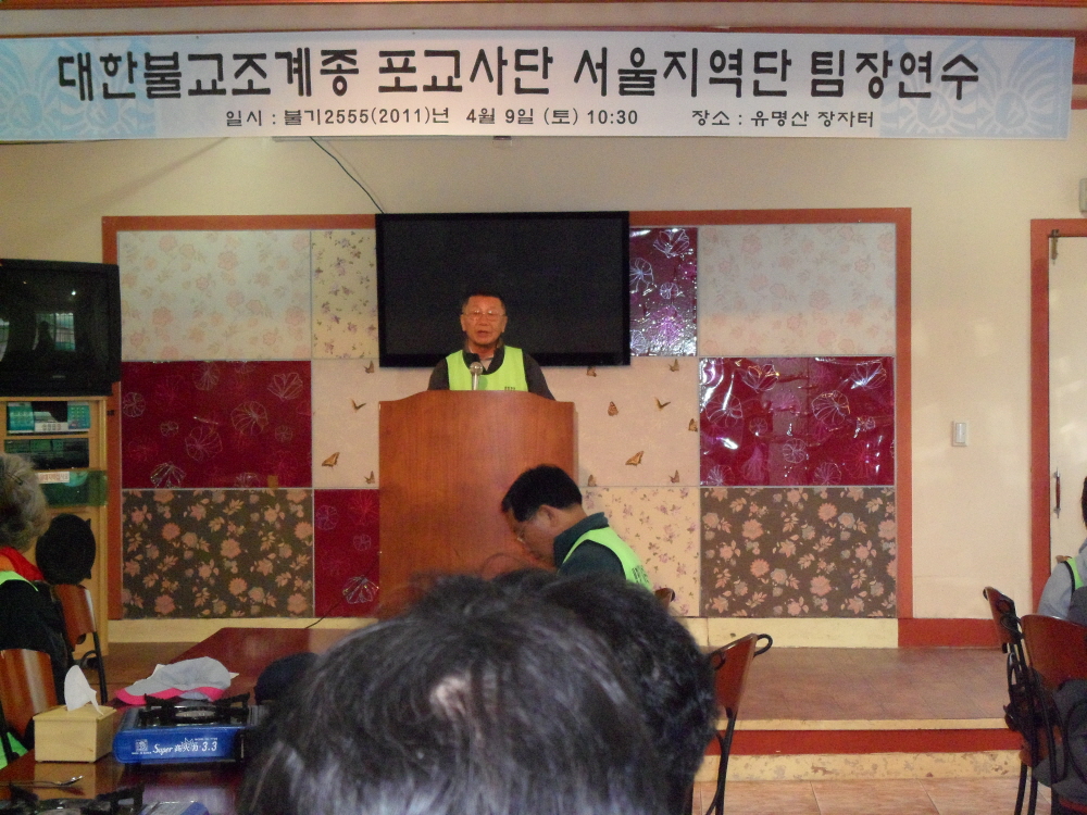 - [서울] 불기 2555년 4월 9일 토요일 오전 10시 30분 경기도 가평 유명산 장자터에서 2011년도 서울지역단 팀장연수가 열렸다. 계영석 부단장의 사회로 시작된 이날의 입재식에는 삼귀의와 한글 반야심경, 포교사단 임희웅 단장의 인사말로 이어졌다. 임희웅 단장은 이 자리에서 화창한 날씨에 팀장연수와 환경봉사를 하게돼 매우 기쁘며 현재 이 시간 내가 있는 이곳에서 깨달음의 길로 가자, 깨달음은 멀리 있는 것이 아니라 오늘 현재 이 자리에서 최선을 다하고 오늘의 환경미화를 열심히 하는 길이라고 말씀하시고 팀 조직 활성화와 불교결집과 조직운영방침 등을 밝히셨다. 이차환 환경특별위원회 위원장의 오늘의 환경미화 일정, 방법과 계획 등에 대한 설명으로 이어졌다. 서울지역단 포교사들의 3시간여에 걸친 유명산 일대의 환경미화작업(쓰레기줍기)은 유명산을 찾은 관광객들에게 감동을 주었다. 이어서 정청현 군 8팀 팀장을 비롯한 팀장들의 활동사례 발표에 이어 홍보분과 고미애 위원장의 사례 발표로 이어졌다. 고미애 위원장은 활동사례에서 기획팀의 팀 단합과 활성화 방안을 발표하고 각 팀들의 홍보방법 등을 말하였다. 오후 3시 30분 사홍서원을 끝으로 이날의 모든 행사를 여법하게 회향하였다. 취재 기획팀장 한애경 법용화 사진협찬 기획팀 홍상기 홍보위원