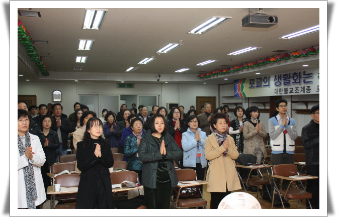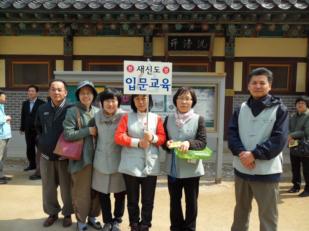 - [서울] 불기 2555년 4월 3일 일요일 오후 12시 대한불교조계종 서울 삼성동 봉은사 (주지 진화스님)에서 새신도 입문교육이 있었다. 총 90여명의 포교사가 소속된 봉은사 포교사회(포교사 연등)는 매주 일요일마다 10여명의 포교사가 한팀이 되어 새로운 신도들에게 불교입문교육과 사찰안내 등을 하고 있다. 새로 입문하는 봉은사 새신도들은 봉은사 수련원에서 포교사들의 지도 하에 절하는 방법, 사찰에서의 예절,불자의 올바른 신행생활 등을 공부한다. 이어서 봉은사 교육국장 묵산스님의 법문과 함께 불교에 대한 궁금한 점을 묻는 차담도 이루어진다. 차담이 끝나고 봉은사 경내를 돌며 각 전각에 대한 설명과 함께 새로운 신도들에게 불법의 중요성 등을 설명한다. 사중의 적극적인 지원 (떡, 과일, 차)을 받으며 이루어지고 있는 봉은사 새신도 입문교육과 사찰안내는 한 사람이라도 부처님의 품 안에 들어오기를 서원하며 최선을 다하고 있는 봉은사 포교사들이 있기에 더욱 빛난다. 취재 기획팀장 한애경 법용화