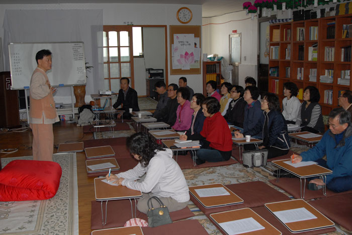 - [충북] 사찰문회 해설 강의가 지난 4월2일 영동지역 포교사 및 중원불교 대학생을 대상으로 있었다 전문 포교사 권중서 교수님의 사찰문화 해설 강의는 2시부터 6시까지 4시간 동안 영동읍내 중원불교대학 법당에서 많은 호응을 얻었다 강의에 앞서 충북지역단 안병옥 단장님과 김임중 부단장님 성석경 팀장님과 함께 중원불교대학 학장 청원스님을 찾아 뵈었다 대웅전에 참배 드리고 스님과의 대담 속에 스님이 느끼시는 절실한 과제를 말씀 하셨다 적어도 사찰에 들어와 사찰문화를 해설하는 해설사는 불자들이 맡아야 함을 강조하셨다 일반인들이 불교를 배제한 채 너무도 엉뚱하게 왜곡을 하고 있다는 지적이셨다 공감하는 부분이다 뒤로는 천태산을 등지고 대웅전과 극락보전이 있고 그 앞에 보물인 3층 석탑이 있다 보리수 나무도 늠늠하게 석탑 옆을 지키고 있는 영국사는 규모에 비해 문화재가 많고 단아하고 포근한 사찰이다 천년의 숨결 영국사 은행나무 당산제 준비에 한창 바쁜 모습이었다 기차를 타고 영동역에 도착하신 권중서 교수님을 모시고 김임중 부단장님 친구분(영동 소재 병원 원장)께서 영동 방문 환영으로 점심 대접을 융숭하게 받고 법당으로 이동 사찰문화 해설 강의 법회를 시작했다 안병옥 단장님의 인사 말씀 영동지역 뿐만아니라 보은에서도 8명의 포교사님들이 참석하여 열공 부단장님의 강사 약력 소개 먼 길 오셔서 강의를 해 주시는 권중서 전문포교사님 충북지역단 사무실에서는 매주 화요일 (4월5일부터) 7시30분에서 9시30분까지 4회에 걸쳐 진행 될 예정이다 지역상 멀리 떨어져 있어서 지역단 사무실에서 함께 강의를 들을 수 없어 하루만이라도 배려를 한 것이다 사찰문화의 대가이신 김정도 전문포교사님도 대전에서 참석하시었다 좋은 강의 해 주신 강사님께 감사드리고 50여명 수강자들에게 많은 도움이 되길 바란다