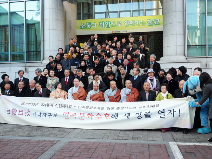 - [포교사단] 기사작성.사진 : 한애경(기획팀장) 대한불교조계종이 주최하고 중앙신도회가 주관한 불기2555년 재가불자신년하례회가 2월 15일 화요일 오후 3시 한국불교역사문화기념관 전통문화예술 공연장에서 열렸다. (재)명원문화재단 후원으로, (주) 연우와 함께가 협찬했다. 불교인재원 김준영 사무국장 사회로 진행된 1부 순서는 여는 마당, 삼귀의례, 우리말 반야심경, 통알 세배, 내빈소개, 2011년도 중앙신도회 주요사업 소개, 민족문화수호를 위한 중앙신도회 실천위원회 경과보고, 공명 메세지와 김의정 중앙신도회장의 인사말로 이어졌다. 김의정 회장은 인사말에서 2011년도 신년하례법회 정진 주제를 ‘자각자구’로 결정했으며 외부로 향한 질서와 투쟁보다는 내적 성숙과 자각으로 당간을 바로 세우고, 승가와 재가가 함께 모든 대중들과 전국 각지에서 불자 모두가 힘을 모아 어려운 난국을 헤쳐 나가자고 말했다. 다음 순서로 민족문화수호를 위한 중앙신도회 실천위원회 발족 임명, 민족문화수호 약정기금 전달, 실천다짐선언에 이어 총무원장 자승스님의 치사로 이어졌다. 자승스님께서는 수천 년을 이어온 불교역사와 문화를 단순한 종교적 가치로 치부하는 작금의 현실은 편향된 인식과 그릇된 정책으로 나타나고 있으며 출.재가를 막론한 범종단적인 자성과 쇄신결사의 길을 함께 걷고 우리 스스로 돌아보는 쇄신결사의 길에 불자 여러분들의 적극적인 동참을 바란다고 말씀하셨다. 이어서 혜총스님께서는 격려사에서 승가와 재가가 하나로 힘을 모아 상구보리 하화중생으로 수행과 실천행에 더욱 박차를 가하고 재가조직의 활성화와 교육 인재 양성과 불교의 정체성 확립과 대사회적 회향으로 국민과 함께 하는 불교를 지향할 것을 말씀하셨다. 포교사단 임희웅 단장은 축사에서 “불국정토 구현을 위해 다함께 더욱 매진해야 하며 새해의 밝음으로 우리나라의 어둠과 자신의 무명을 정연하게 마름질하고 우리들의 닦아온 진리와 삼보의 믿음은 아무리 어려운 세상살이도 다 이겨내게 할 것입니다. 이 길은 `처음도 좋고 중간도 좋으며, 끝도 좋은 길입니다.”라고 말하며 포교사단은 여러분들과 함께 정진하겠다고 다짐하였다. 참가대중 모두가 함께하는 새해 발원문과 사홍서원 기념촬영으로 1부 순서를 마쳤다. 2부 전시회 오프닝에서는 민족문화수호기금 마련 전시회 (장소: 한국불교역사문화기념관 나무갤러리, 기간 : 2011년 2월 15일~23일) 오프닝이 있었고, 3부 다과회(한국불교 역사문화기념관)를 끝으로 모든 행사를 여법하게 봉행하였다.