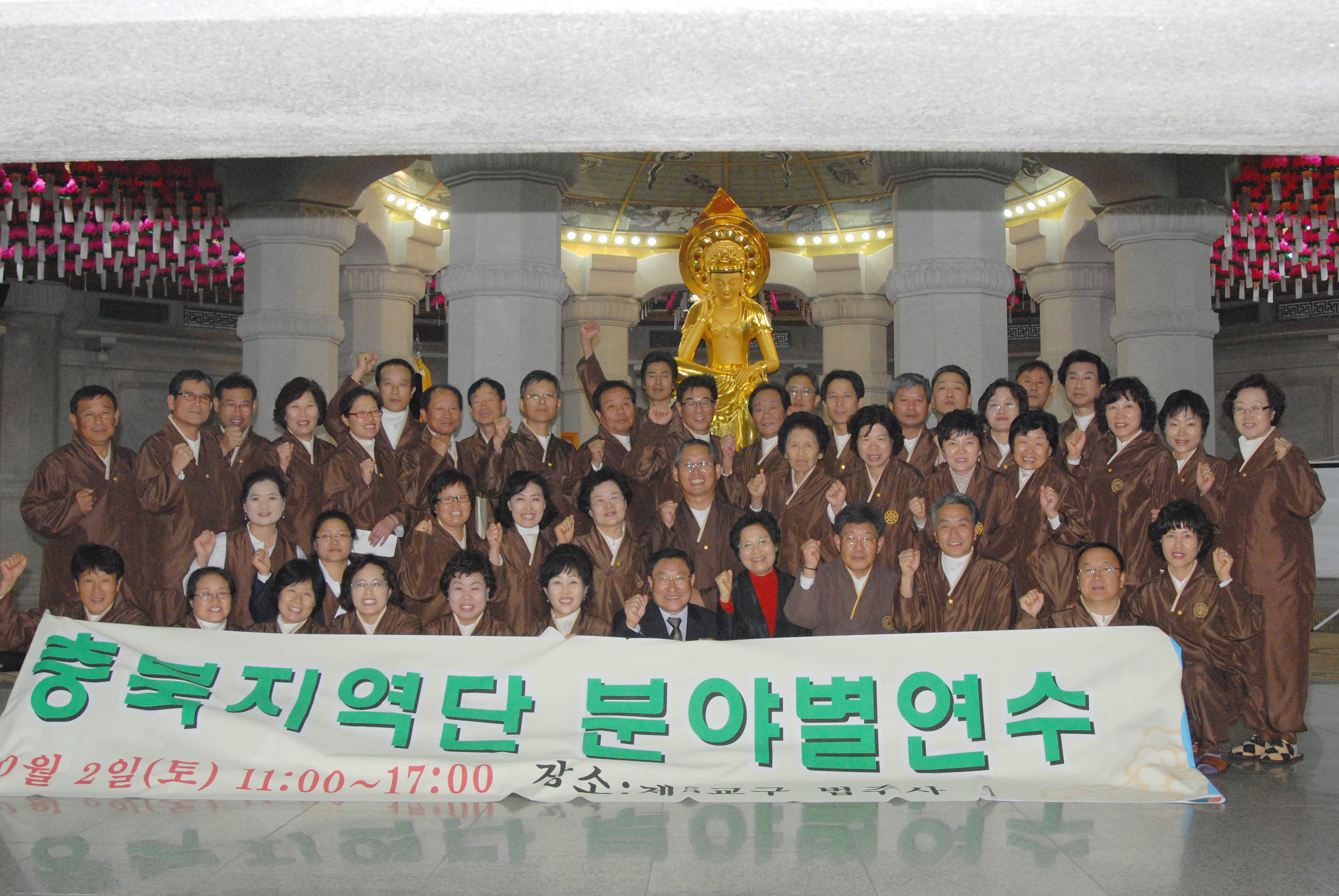 - [충북] 불기 2554(2010)년도 충북지역단 분야별 연수가 10월 2일(토요일) 11시 제5교구 본사 속리산 법주사에서 있었다 사회 김홍남 사무국장 집전 윤종한 부단장 법주사 주지 노현스님을 모시고 대웅보전에서 입제식을 봉행했다 15기 포교사들은 처음 참석하는 연수 창단 5개월 하나하나 자리가 잡혀가고 있다 때론 무리수도 있지만 성장을 위한 과정인 것이다 안병옥 단장님의 인사 말씀 포교사단 임희웅 단장님을 대신해서 부단장님께서 인사 말씀을 해 주셨다 제5교구 본사 법주사 주지 노현스님 격려사 포교란 하심하고 배운대로 실천하면 된다 하시며 베푸면서 초심을 잃지말고 수행하길 당부하셨다 15기 포교사 일동의 포교사의 다짐 낭독 포교사단으로부터 금일봉을 격려금으로 전달 받았다 대웅보전에서 입제식이 끝나고 점심 공양 후 미륵전으로 장소를 옮겨 1시부터 분야별 연수 실시 분야별 사례 발표 첫번째로 군포교 2팀 혜초 윤홍근 포교사님의 사례 발표 두번째 염불포교 2팀의 문성 김두한 포교사님의 사례 발표 세번째 자원봉사팀 도호 정해석 포교사님의 사례 발표 이어 지역단장님의 분야별 활동 평가 7개 분야별 (군포교/염불포교/자원봉사/지역봉사/사찰문화해설/음성포교/홍보)로 상세하게 평가를 해주셨다 포교사단 곽명희 부단장님께서 충북지역단 활성화 방안에 대해 여러가자 안을 제시해 주셨다 충북지역단의 분야별 발전 방향에 대해 분야별 그룹(9개조-군포교/대학청소년/사찰문해설/사회복지/어린이포교/염불포교/음성포교/자원봉사/지역봉사) 토론 시간 서로의 의견을 모으고 있는 중 분여별 그룹 토론 후 토론 결과 발표를 토론 조장이 했다 법주사 총무 영원스님 격려사 스님을 따르지(따라서 하지) 말고 부처님을 따르라 포교사들이 해야할 일은 포교사 스스로가 해야한다 부처님에게도 스님에게도 그 누구에게도 기대하지 마라 하심을 하고 초심을 잃지 마라 노현스님과 마찬가지로 하심과 초심을 강조하셨다 지금 우리 포교사들에게 절대적으로 필요한 말이다 초심이란 처음 하고자 하는 마음을 중단하지 않고 끝까지 가는 것 영원스님께서 직접 쓰신 초심이란 문구를 주셨다 각자 초심을 잃지말길 간절히 간절히 기원하면서~~~ 곽명희 포교사단 부단장님의 회향사를 끝으로 분야별 연수 11시에서부터 시작하여 5시에 모두 마쳤다
