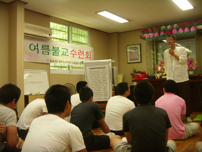 - [광주전남] 광주전남 지역단 소속 교정교화1팀(소년원팀)에서는 8월 5일부터 6일까지 2일간 광주 소재 소년원(고룡정보산업학교) 종교실 법당에서 이곳 소년원 원생들과 함께「여름불교 수련회」를 실시하였다 이번 행사는 교정교화 1팀이 주관하여 해마다 개최하는 연례행사로서, 여름과 겨울로 나누어 연 2회 실시하고 있다 행사 진행은 이재언 팀장을 주축으로 전임 단장인 김인수포교사와임천택 감사,한정순 포교사,윤경숙 간사 장송기 직장직능팀장 등 포교사 10여명과 일반 신도가 분야별로 나누어 함께 실시하였다. 행사내용은 행사 첫날 입재식을 시작으로 참선 및 실수, 설법과 불교 기초교리, 찬불가 연습, 비디오 상영 등을 하게 되며, 다음 날에는 한글천수경과 사경을 하였고, 불교의 설화와 신행담, 찬불가와 칭찬 릴레이,마음을 다스리는 법, 참다운 공양에 대한 설법이 있었다.그리고 108참회정진을 끝으로 회향하였다. 행사 중간에 음료와 과일 등 간식을 제공하는데, 금번 1차 합격자 이소영 법우와 이숙재 법우가 참석자 전원이 나누어 먹을 수 있도록 먹거리(통닭)를 보시하였다 교정교화 1팀에서는 금번 행사를 「남을 배려하면 행복해진다」라는 주제를 가지고, 이에 맞게 프로그램을 구성하여 마음을 다스리는 법에 대해 사경하고 참선을 하는 등, 원생들이 자신을 돌아보는 계기를 만들고 느끼도록 하였다.