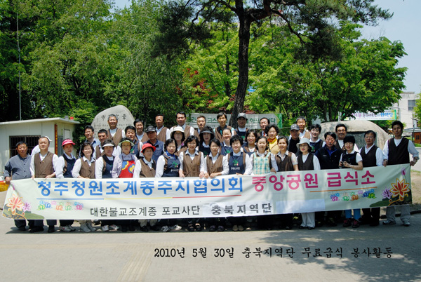 - [충북] 매주 일요일 청주청원사찰 및 신행단체에서 청주중앙공원 노인들께 무료급식을 한다대상 인원은 약800명평소에도 공원에는 많은 어르신들의 휴식처로 이용되고 있지만 유독 일요일에 급식 인원이 많이 모이는 이유는 그동안 베푸는 정이 깊어 소문이 나있기때문일 것이다평일 타 단체에서도 실시하고 있지만 일요일 규모에 비하면 30%(2~300명 수준)밖에는 안된다 한다매주마다 계획표가 짜여있어 포교사단 충북지역단은 5월과 10월 두차례 배정이 되어있다점심 식단은 묵밥밥 10말묵 4Kg짜리 60BOX요구르트 800개김치는 윤종한 부단장님, 곽훈기 지역봉사 1팀장님, 지역봉사 2팀 박복희 총무 보시포교사 60여명봉우회 회원 10명선재봉사단 학생 12명2010년 5월 30일 일요일 신록이 우거진 청주 중앙공원포교사단 충북지역단(단장 안병옥) 포교사 60여명이 무료급식 봉사활동을 하였다봉우회 회원들이 이른 아침에 나와 천막과 가스불, 그릇등 기타 시설물을 준비해 준다전날 준비된 식재료들을 손질계절이 좋은지라 예식장에 가셔야 될 포교사님들 여벌 옷을 한벌씩 더 챙기고 봉사 중포교사 봉사 모드에서 예식장 모드로 변신을 해야한다일 열심히 하시고 점심은 예식장 가서 드시면 된다다듬고 썰고 모닝커피까지 각자의 할 일이 자연스럽게 배정이 된다김치는 채썰어 수분을 제거기본 4인분에 익숙해져 있어 800명분이란 어림 짐작도 안된다묵 채썰기도 만만치않다충북지역단 비밀 재료가 한가지 이상 들어간 육수 만들기 ㅎㅎㅎ뜨겁지만 국물 맛 시원한 육수가 냄새만 맡아도 명품임을 알 수 있다모두 모두 열심히 일에 몰두15기 예포들 몸 사리지않고 하는 모습은 선배들이 한 예전의 모습이다가지런히 예쁘게 담아 배식 시간을 기다리고 있다배식 시간은 11시 30분미리 줄을 서서 기다리시는 어르신 또는 어느정도 줄이 빠지기를 기다리시며 그늘에서 쉬고 계시는 어르신들배식이 시작되면 손길이 바빠진다식기전에 얼른 따뜻하게 드실 수 있게 배려를 해야하니까~~~그야말로 척척이다맛있게 드시고 건강하세요~~~청주.청원조계종주지협의회휠체어 타신 장애인분들은 줄을 서지않아도 따로 뒤로 오면 개별적으로 제공이 된다불편하신 분은 선재봉사단 학생들이 직접 먹여주기도 한다저분이 나타나자 얼른 달려간다한두번 한게 아니라 많은 시간 꾸준히 보현행을 하고 있는 학생30분 정도 정신없이 배식을 하면 거의 끝이 난다우리도 배식받아 각자 자리잡아 얼굴 마주보며 정답게 먹는다멀리 옥천 보은에서 지원 오신 15기 예비포교사님시설물 철거, 설겆이 마지막으로 충북지역단 길카페 커피 한잔으로 마무리 하면서싱그러운 5월의 태양 아래 하늘을 우러러 한점 부끄럼없이 살겠다고 부처님께 발원을 한다