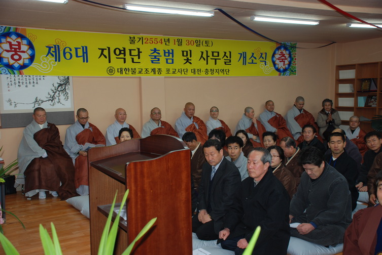 - [] 불기 25554년(2010)1월 30일 대한불교조계종 포교사단 대전충청지역단(단장 강호회)은 대전시 중구 태평동에 사무실을 마련 개소식을 봉행하였다.대전충청포교사단은 오랜 숙원사업이였던 사무실을 마련함으로 대전충청 포교사단의 안정되고 체계적인 포교활동과 교육 강화로 질 높고 역량 있는 포교사 배출에 발판을 마련하게 되었다.개소식에는 오전 탱화 점안식과 오후 개소식으로 나뉘어서 치러졌으며, 최종대 사무국장의 집전과 서남교 팀장의 사회로 경과보고, 공로패 전달, 감사패 전달 및 축사와 설법 등으로 진행되었다.이날 개소식에는 마곡사 주지스님이신 원혜스님과 천안 각원사 불교대학장이며 천안 사암연합회 회장이신 대원큰스님, 포교국장이신 남전 스님 등 10분의 스님들이 참석하셨으며 임희웅 포교사단장과. 권대자. 곽명희 포교사를 비롯하여 대전충청 포교사 60여명이 참석을 하였다. 강호회 대전충청포교사단장은 취임사 및 개소식 인사말을 통하여 하심하고 공부하여 타의 모범이 되는 불자가 포교사라며 새로이 마련된 이 사무실이 포교의 도량 교육의 도량이 되기를 간절히 바란다 하였다. 임희웅 중앙 단장은 격려사를 통하여 중앙단과 대전충청지역단과의 영상통화가 가능한 시스템을 제일먼저 구축하겠다며 한반도 허리역할인 대전충청포교사단의 중요성을 강조하였다.축사에 나선 대원큰스님은 스님과 포교사들이 함께 해 나갈 때 비로소 원만히 불사가 이루어 질 수 있다며 종파를 초월하여 재가와 승가가 모두 협력해 불교 발전의 기틀을 만들자 하셨다.또한 포교국장이신 남전스님은 포교원에서도 불교의 사회적 역량을 강화하기 위하여 노력하고 있다며 포교사들의 적극적인 참여를 바란다 하였으며, 설법에 나선 마곡사 주지 원혜스님은 배움과 수행을 함께하는 참다운 불자가 되어야 한다며, 사무실 개소식을 진심으로 축하, 환영한다고 말씀하셨다.한편 백제불교회관 장곡스님과 법주사 포교부장스님이신 보림스님, 천안 부루나유치원 원장님이신 광현 스님 등은 그동안 포교사단을 지원해주시고 격려해주신 공로로 혜총 포교원장님이 수여하시는 공로패를 받았으며 대전충청 5대 단장 이였던 전채근 단장에게 감사패를 수여했다.