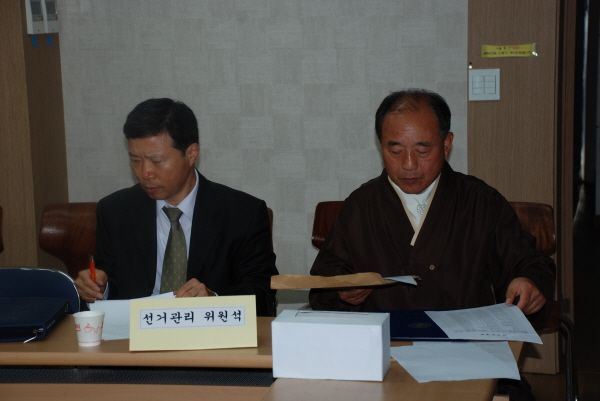 - [] 10월 30일 오후 8시에 운영위원 48명중 45명이 참석한 가운데 실시된 대구경북지역단장 선거에서 김상수 후보 25표, 정재분 후보 19표, 무효 1표로 김상수 현 지역단장이 재선되었다. 전례없는 경선으로 선거과정에 다소 과열과 잡음이 있었으나 지역 카페를 통해 공개질의서를 제안하고 사전에 각자의 정견발표와 격려의 글과 비방의 글도 있었지만 선거를 통해 지역 전포교사가 단장선거에 관심을 보임으로써 포교사단의 발전에 지대한 영향을 끼쳤으며, 일반 포교사들의 직접선거 요구가 거세어 앞으로 고려해봐야 할 것 같다.1. 본격적인 선거에 들어가기 전에 포교부장 계성스님의 포교결집 대회 안내겸 포교사단의 나아갈 길에 대해 1시간의 말씀이 있었다.2. 8시경에 임시의장으로 조수호 부단장을 선임하고, 운영위원에 대한 출석점검을 하여 48명중 45명이 참석하여 성원이 되었음을 보고하고 지역단장 선출을 위한 회의를 시작하였다. 3. 리수실 선거관리위원장과 이세체 선관위원, 장재영 선관위원이 주관하여 김상수 후보자, 정재분 후보자 순으로 각각 5분씩의 정견 발표가 있었다. (원만한 선거진행을 위해 투표권이 없는 포교사들은 법당 밖으로 나가서 지켜보았다.)4. 이어서 운영위원이 한 명씩 호명에 따라 신분증으로 신분확인을 받고 투표용지를 받아 기표소에서 기표후 투표함에 투표하였다. (장재영 선관위원이 남구선거관리위원회에서 개표함 2개와 기표소 2개를 대여해 와서 설치해 둠)5. 투표완료후 양측의 참관인 입회하에 개표를 하고, 확인 또 확인하였다.6. 선관위원으로 부터 개표 결과 발표가 있었고(김상수 25표, 정재분 19표, 무효 1표로 김상수 후보 당선) 이어서 당선확인증 수여가 있었다. (정재분 낙선자가 김상수 당선자를 찾아가 축하의 인사를 하다) 7. 김상수 당선자의 인사말과 정재분 낙선자의 인사말이 있었고, 포교부장의 마무리 말씀이 있은 후 사홍서원을 끝으로 폐회하였다.