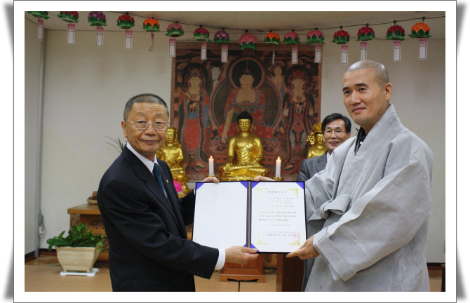 - [서울] [서울 경기]제6대 지역단장 포교사 당선되다2009년 10월 21일(수) 대한불교 조계종 포교사단 서울 경기지역 단장 선거를 임시 운영위원회를 통하여 선거인단 74명중 과반수이상(67명)이 참석한 가운데 포교국장 부명스님과 포교원 직원 선거관리위원이 지켜보는 가운데 엄정하게 진행되었다.이자리에서 임희웅후보 35표, 임원갑후보 32표를 획득한 가운데 임희웅 후보가 제6대 서울경기 지역 단장에 선출 되었다.포교국장 부명스님께서는 임시 의장을 현단장님으로 (강홍원) 임명한 가운데 진행 되었으며 스님께서는 "이번 선거에 포교원이 직접 선거를 관리하게 되었으나 실직적 주체는 포교사 여러분입니다. 선거의 불협화음이 우려된바 조절이 필요하여 중재 관리 하였음을 양지해 주시기 바라며 차기 집행부의 부담을 덜어 주고자 하였습니다. 상당 부분 정관등에 문제가 있음을 발견하였으나 차후 과제로 남겨두고 현재의 규정에 따라 선거를 진행하게 되었음을 이해 바라며 혹시 불편한 마음이 있을 지라도 악법도 법입니다.부처님 당시에도 일상 생활에 문제가 발견 되었을때 포살이나 자자 대중공사를 통하여 해결하였으며 이번 기회로 포교사단이 한단계 나아지는 모습으로 발전의 산고를 겪는 것이다. 오늘 선거를 여법하게 진행하여 모자라는 부분은 차후 과제로 남겨두고 성숙한 모습으로 현재 진행되는 선거에 최선을 다하자" 라며 격려해 주셨다.기호1번 임희웅 후보, 기호 2번 임원갑 후보의 5분씩 정견 발표가 있고난후 선거 점명부확인과 투표용지 발부와 신원확인후 긴장한 가운데 직접 선거에 들어갔다.드디어 개표후 임희웅 후보가 35표로 당선되었음을 알렸다.임희웅 후보는 당선 수락 연설에서 "임진강물과 한강물이 비로소 인천 앞바다에서 만났습니다. 바닷물은 한맛입니다. 한국불교의 빛나는 열매를 위해 파사현정의 수행 정신으로 삼보를 공경하며 맡은바 책무를 다해 나갈 것입니다"라며 당선 인사말을 하였다. 임원갑 후보와 정정당당히 경쟁한후 서로 손을 맛잡고 만세를 부르며 상대방을 격려하며 성숙된 포교사 의식을 선보였다.현 강홍원 포교사단장으로부터 당선증을 전달 받았으며 다시 포교국장 부명스님께서는" 불교가 지향하는 슬로건은 세계일화이다 부처님이 말씀하신 전도선언과 같이 중생의 이익과 안락을 위하여 앞으로 전진합시다" 라며 마무리 말씀을 해주셨다.▲ 좌 임원갑 후보, 우 임희웅 후보▲ 선거인단과 투표 참관인 ▲ 포교국장 부명 스님▲ 임희웅 후보 정견발표▲ 임원갑후보 정견 발표▲ 양진영 투표 참관인▲ 투표 실시