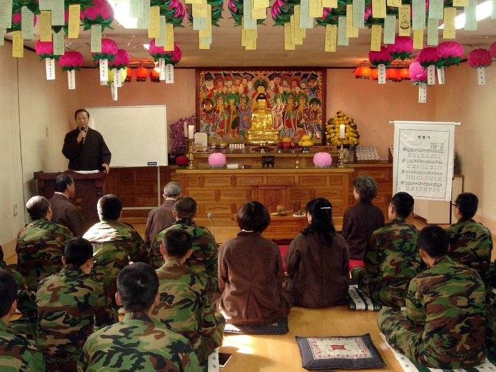 - [부산경남] 경남지역총괄팀, 호국팔용사에서 군포교 체험법회 개최▣ 경남지역 총괄팀은 불기 2553(2009)년 10월 25일 창원시 팔용동 죽전부대 제 9 탄약창 호국팔용사에서 보현팀과 금강팀 공동 주관으로 10월 정기법회겸 군포교 체험법회를 개최했다.오전 9시 부터 3시간에 걸쳐 진행된 이날 법회에는 경남지역 총괄팀장 정지견(허점자) 회장을 비롯한 포교사 20여명과 군장병 80여명이 참석하였으며, 대광사 어린이 사물놀이패가 찬조 출연하여 포교사 및 군장병들로 부터 뜨거운 박수 갈채를 받았다. ▣ 이어서 열린 자유토론 시간에는 금년도 마무리 및 2010년도 포교사 활동 방향에 대한 열띤 토론이 펼쳐졌으며, 정지견 회장은 "경남지역총괄팀에서 주최하는 정기 법회 및 각종 행사에 포교사들의 적극적인 동참과 지속적인 관심을 당부한다."는 말로 회향사를 대신했다. 정리 / 혜안 강신 포교사게재 / 실상 권중하