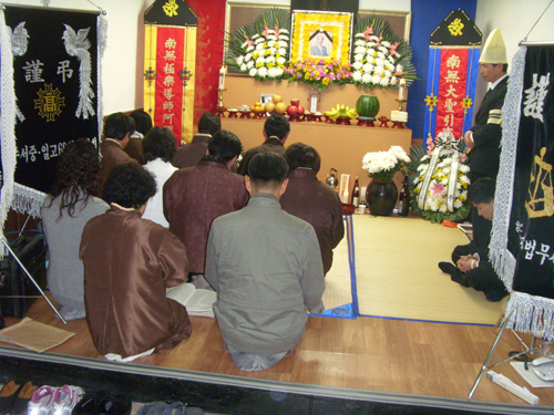 - [] 광주전남지역단에서는 현 포교사단장인 강홍원포교사의 부친상이 전남 나주시 산포 빛가람장례식장에서 치루어지게 됨에 따라, 염불포교팀이 현지에 내려가 염불봉사를 하였다 금번 염불봉사는 진주후인 강대훈영가의 극락왕생을 비는 의식으로서, 11.2일 저녁 7시부터 시작하여 9시까지 2시간여에 걸쳐 실시되었으며, 9시가 지나 염불이 끝남에 따라 모두가 늦은 공양을 하였다. 염불 봉사 진행은 무량행 강경자 포교사의 집전을 시작으로, 진문 나홍주 포교사가 이어 받았으며, 목탁은 보련화 조은미포교사가 담당하였다 염불봉사 순서는 보례진언 - 십념 - 천수경 - 거불 - 청혼(영가) - 왕생성 불발원문 - 의상조사법성게 - 화엄경약찬게 - 금강경32분 - 영가시어 - 우리말 무상계 - 영가 천도진언 - 반야심경 - 광명진언 - 해탈주로 마무리 하였다 염불포교팀은 여느 때처럼 광주 무각사에 모여 승용차 3대로 이동하였 으며, 팀원들의 적극적인 참여와 성심을 다한 염불로, 여법하개 염불봉행을 치룰 수 있었다. 특히, 이번 염불봉사는 포교사단의 단장 부친의 염불이라서 그런지, 더욱 장엄하고 엄숙한 가운데 의식이 치루어져, 이를 지켜보는 조문객들도 관심 있게 지켜보았다.