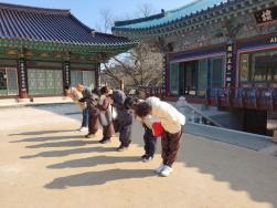 - [울산] 1윌15일 일요일 청보리팀 활동 정토사 어린이 템플스테이에 청보리팀이 함께하였습니다. 겨울비가 내려 조금은 쌀쌀한 가운데 진행된 템플.. 첫번째 시간이 함께 배워보는 사찰 예절에 보림화님 자비행님 구선향 정화심님 함께 하였습니다. 보림화님 마이크 잡으시고 까만 눈동자들 집중시켜 알아듣기 쉬운 설명을 곁들인 지도, 자비행님,정화심님 시연으로 차수, 합장, 반배, 삼배, 고두례, 장궤합장, 삼귀의, 사홍서원까지 잘마무리였습니다. 오후 1시40분부터 탑돌이는 비가내려 범종각에서 범종을 돌았습니다.연화행단장님, 자비행님, 구선향,정화심님,.100여명의 친구들이 여섯팀으로 나눠어져서 팀 미션 완수하고 범종각으로 오는 팀에게 짧게 나마 범종을 설명하고 정근을 하면서 범종돌이를 하였습니다. 많은 친구들을 위해서 정근 목탁치는 방법을 잠시 배워주고 함께 목탁을 치며 정근하며 돌기도 하였습니다 까아만 눈동자와 고사리같이 작은 두손을 모아 부르는 석가모니불~ 석가모니불~~ 석가모니불~~~ 글 : 구선향/ 서영순