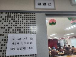 - [포교사단] 불기2569(2025)년 10월 21일 13:30부터 대한불교조계종 포교사단 제9차 임원회의가 본단 강의실에서 개최됐다. 김영석(범일) 포교사단장을 의장으로 모시고 포교사단 임원과 전국 13개 지역단 단장이 참석하여 재적인원 20명중 16명의 참석인원으로, 사회를 맡은 강의수(희재) 포교사단 수석부단장의 성원보고와 의장의 개회선언으로 회의를 시작했다. 예식 전, 14대 포교사단장으로 선출된 강의수 현 수석부단장, 부산지역단장으로 선출된 박종안 현 사단 부단장 그리고 13대에서 14대로 연임된 경남지역단 이원환 단장, 제주지역단 강윤호 단장을 축하하는 케이크 컷팅식을 진행했으며 참석임원 전체 기념사진을 촬영한 후 삼귀의, 반야심경을 봉독하고 대념처경 서문을 독송 한 후 본격적인 회의에 들어갔다. 회의는 전 회의결과 및 활동보고에 이어 심의안건과 토의안건을 상정하여 의견을 수렴 했으며 공지사항과 사홍서원으로 회의를 마쳤다. 심의안건으로 2025년 포교사단 예산안 추경 건을 의결하였으며, 토의 안건으로 사단법인 설립의 건을 상정하여 토론하였고, 공지사항으로는 각 지역단 전진대회 시행건 및 포상자 추천건, 군법당 개보수 보조금 지원안내, 불교문화해설 포교활동 우수사례 공모전 안내등을 했다.