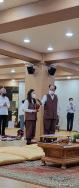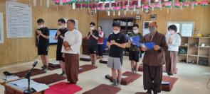 - [서울] 2566(2022)년 6월 26일 대한불교조계종 포교사단 서울지역단 제27기 포교사 1차 합격자 중 1조와 5조가 육군 제25사단 감악산 대대 용주사 군법당에서 군 포교분야 현장교육을 받았다. 경기도 파주시 적성면에 위치한 용주사 군법당은 북부군1팀이 꾸준하게 부처님의 말씀을 육군 장병들에게 전하는 법당이다. 이날 대한불교조계종 포교사단 성수 서정각 단장, 북부군1팀의 심자재 강선숙 포교사(팀장), 원행심 강은자 포교사, 성수 임동석 포교사, 대경 박수정 포교사, 북부군3팀의 평전 하용수 포교사, 산머루농원의 서우석 회장이 참석해 자리를 빛냈다. 대한불교조계종 포교사단 성수 서정각 단장은 "육군 제25사단 감악산 대대 용주사 군법당을 지키는 주인공인 장병 여러분에게 깊은 감사를 드린다. 또 처음 군법당에 발걸음을 한 제27회 포교사 선발 자격고시 1차 합격자들에게 감사드린다. 용주사 군법당을 유지관리해오고 장병들에게 마음의 양식과 안온과 지혜와 자비심을 일깨워주기 위해 불철주야 애쓰는 강선숙 팀장님과 팀원들에게 깊은 감사를 드린다. 포교를 하는 입장에서 군법당은 가장 좋은 곳이며 장병들에게는 군법당에 오는 것이 청년 시절 가장 기억에 남는 일이 된다. 앞으로 전역 후에 어떻게 살아가는 가에 대한 것을 부처님의 혜안을 배워 지혜로서 스스로 개척해나가는 원동력의 힘을 얻는 가장 중요한 시간과 장소가 군법당이다. 언뜻 보기에는 지도하는 사람들이 중요함과 유익함을 만들어내는 것 같지만 여기에 온 여러분들이 스스로 만들어내는 것이다. 부처님께 매주 예불하고 설법과 명상으로 마음과 몸을 이완시키고 통찰해 평정심을 찾고 평정심을 꾸준히 이어가는 것이 수행이다. 이 자리에 참석한 모든 분들의 가정마다 부처님의 자비광명이 늘 함께하길 기원한다"고 말했다. 심자재 강선숙 포교사는 "서정각 단장님께서 용주사에서 팀장을 할 때 관세음보살님을 새롭게 개금불사하고 점안법회를 했다. 군법당에 오는 장병들은 대부분 사회에서 불교를 접하지 않은 장병이 많은데 앞으로 불교를 접하고 부처님의 가르침을 배우면서 불교에 접하는 계기가 되었으면 좋겠다. 매주 빠지지 않고 장병들이 나왔으면 좋겠고 나올 때 친구와 함께 와서 부처님의 말씀을 들어보면서 마음을 단단하게 하면 좋겠다"고 말했다. 성수 임동석 포교사는 설법에서 "장병들이 군 생활을 하느라 고단할 텐데 귀한 시간을 내서 이렇게 부처님의 말씀을 들으려고 와주어서 감사드린다. 부처님이 누워있는 조각상을 절에서 본 적이 있을 텐데 이를 와불이라고 한다. 정말 피곤한 장병들은 잠시 자도 되고 편안한 마음으로 큰 부담을 갖지 말고 자주 와주었으면 좋겠다. 여기에서 의식 집전을 접하다보면 기존에 알고 있는 의식 순서와 다를 수도 있는데 맞고 틀리다의 문제가 아니고 다름이라는 측면에서 바라보면 좋겠다. 포교사단은 모든 의식을 한글로 진행한다. 집에 말티즈 강아지를 15년 동안 길렀는데 최근 시력을 잃으면서 돌보다가 마음을 다스리는 것이 중요하다는 것을 다시 한번 깨닫게 되었다. 불교 교리를 많이 알아도 마음 하나 다스리지 못하면 안된다. 벌써 6월 말인데 절에서 말하는 초심은 항상 마음을 새롭게 갖는 것을 의미한다. 초발심시변정각이라는 말이 있는데 처음 발심할 때, 부처님을 믿기로 한 때가 바로 지혜를 이루고 득도한 때라는 뜻이다. 군 생활이 힘들고 어렵고 시간이 안간다고 느껴질 수 있지만 부처님의 말씀을 통해 마음을 늘 새롭게 다잡는 연습을 하면 좋겠다. 앞으로 제대하는 장병들은 복학해서 공부를 할 텐데 그 때에도 부처님의 말씀을 믿고 본인이 원하는 바를 간절히 바라고 추구한다면 깨달음을 통해 원하는 것을 얻을 수 있게 된다. 군 생활을 하는 동안 스스로 주인공이라는 점을 깨닫고 어려운 상황을 슬기롭게 헤쳐나가면 좋겠다"고 말했다. 평전 하용수 포교사는 "군포교를 하면 보통 4명이 각 주에 차를 타고 가게 된다. 운전을 잘하는 사람, 집전에 능숙한 사람, 설법에 능숙한 사람이 4명 안에 각각 배정되는 것이 법회를 원할하게 진행하는 데 도움이 된다. 또 코로나19로 인해서 기존에는 2월에 시험을 보고 순차적으로 교육을 했다가 교육기간이 다소 짧아지다보니 힘들고 버겁다고 느낄 수도 있겠지만 이 기간이 지나면 많은 성장을 이룰 수 있기 때문에 너그럽게 이해하고 잘 참여하는 마음을 내주면 좋겠다. 또 군법당에서는 포교사들이 스스로 공부해서 부처님의 말씀을 전하기 때문에 좋은 수행의 기회가 된다는 점도 알아주면 좋겠다"고 말했다. 이날 강선숙 포교사가 장병들에게 명상을 하는 방법에 대해 알려주면서 체험해보는 시간도 가졌다. 호흡이 일어나고 사라지는 것을 느끼면서 마음을 다스리면 좋겠다면서 함께 명상을 했다. 한편, 대한불교조계종 포교사단 서울지역단 성수 서정각 단장과 평전 하용수 북부군3팀장은 용주사 북부군1팀에 보시금을 전달하면서 격려했다.