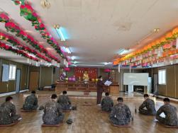 - [울산] > 드디어 만났습니다!!! 7765부대 기동대 장병 9명을~~~ 입구에서 신속항원검사 통과하고 들어가니 싹싹하고 똘똘한 군종이 세팅을 다 해놨습니다. 묘각 전기택 포교사님은 법당에 공양 올리고, 장병들의 먹거리를 공수해 오시고, 지난주의 절 하는 예법에 이어 오늘은 지수 신호근 포교사님의 집전으로 법회의 의미가 무엇이며, 어떻게 하면 되는 지를 진행순서에 맞추어 차근 차근 알려주셨습니다. 장병 중에는 평소 절에 다녀본 사람도 있고, 천주교인도 2명 있었는데 진지하게 예법에 맞춰 의식을 잘 따라하였습니다. 저는 법회중에 나오는 삼귀의, 찬불가(우리도 부처님 같이), 사홍서원의 의미에 대해 설명하고 노래를 같이 익혔습니다. 신세대들은 악보를 보고 곧잘 따라 불렀습니다. 법당문을 나서기전에, 꼭 다시 만날것을 다짐하며 한컷!!! 활활발발한 우리 장병들 멋지죠^^ 글 : 손수정/금강수/24기