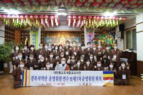 - [경북] 불기 2566(2022)년 1월 23일(일) 14:00 경북지역단 제12대 출범을 알리는 운영위원 연수 및 제1차 운영위원 회의가 대한불교조계종 제8교구 본사 직지사 말사 개운사 관음전에서 개최 되었다. 김승현 사무국장 사회로 운영위원 임명장 수여와 이미숙 단장 인사, 지도법사 일균스님의 특별법문이 있었으며, 강의수 자문위원의 코로나19 시대의 불자 역할에 대한 특강이 있었다 이미숙 단장은 인사말에서“ 지금의 코로나 팬데믹의 어려운 시기를 극복하고 탈종교시대에 포교역량을 펼치기 위해 함께 고민하여 근본으로 돌아가라.’는 말이 있듯이 근본적이고 근원적인 현재 처한 여러 가지 상황을 관찰하고 찾아낸다면 분명 답을 얻을 수 있을 것이다.”라며, “ 무엇보다 일상의 삶에서 불자로서 보시, 지계, 수행 정진하며 급변하는 이 시대에 걸맞은 역량을 길러 새로운 집행부로 구성된 제12대 경북지역단의 첫 출발에 운영위원들의 적극적인 동참과 지원을 부탁한다.”고 말했다. 지도법사 일균스님은 임명장을 받은 운영위원들께 축하하며 각자 소임에 따라 열심히 활동해주길 바라며. 하심하는 마음으로 산다면 결국은 자신이 존경받는 사람이 되어 있다는 것을 명심했으면 좋겠다.”고 당부했다. 이어진 제1차 운영위원 회의는 운영위원 소개와 2022년 사업 계획 안내, 운영위원회 회의 미개최 대비책으로 임원회의로 의결사항 위임, 2022년 예산 조정에 대한 심의가 있었다.