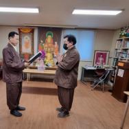 - [강원] 불기2565년 10월 16일 11시 지역단 사무실에서 제11대에 이어 제12대 강원지역단장에 당선된 원경 김효현단장님의 당선증 수여식이 있었습니다 수여는 광진 최상호 선거위원님께서 해주셨습니다 다음은 단장님 인사말씀 올립니다 [코로나 위기상황 속에서도 가내평안과 건안하심이 부처님 가피속에 무탈하게 계신다는 소식을 접할 때 마다 반가운 마음 금할길 없습니다. 제 11대 포교사단 강원지역단장 소임을 맡고 있으면서도 코로나로인하여 전세계적으로 거리두기등의 활동제한으로 임무를 다하지 못하였음을 다시한번 머리숙여 참회합니다. 저를 믿고 한번 더 기회를 주심에 대하여 지역단의 화합과 발전을 위하여 분골쇄신 할것을 약속 드리며 모든 현안을 일선 팀장님들과 협의하며 소통의 장을 만들어 나아가겠습니다. 새적 변화에 능동적으로 대응하여 앞으로 운영위원회의는 줌을 통한 화상회의의 형식을 채택하여 장거리이동의 불편을 최소화 하게습니다. 평소에 지도편달과 조언을 다시한번 가슴깊이 새기며 더욱 힘있게 열심히 지역단을 이끌어 가겠습니다. 우선 지면으로나마 인사에 갈음 합니다. 빠른 시일내에 찾아뵙도록 하겠습니다. 건안하심을 기원드립니다_()_