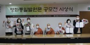 - [인천경기] 부처님 자비 정신을 바탕으로 남북 평화와 통일, 민족 화해의 서원을 담은 ‘평화통일발원문 공모전’ 심사 결과, 이석준 조계종 포교사단 인천경기지역단 포교사가 조계종 총무원장상을 수상했다. 조계종 민족공동체추진본부(본부장 월우스님)는 5월31일 한국불교역사문화기념관 2층 대회의실에서 ‘평화통일발원문 공모전’ 시상식을 개최하고 우수작으로 선정된 작품에 상패 및 상금을 수여했다. 이번 공모전에는 총 46개 발원문이 접수됐으며 사찰 및 교계 단체, 신행 모임에서의 활용도 등을 평가해 9명 발원문이 수상작으로 선정됐다. 시상에 나선 민족공동체추진본부장 월우스님은 “이번 공모전을 통해 평화 통일에 대한 우리 불자들의 염원을 확인할 수 있었다”며 “불자들의 진심어린 신심이 담긴 발원문이 여러 사람에게 읽히는 동시에 남북의 평화 통일을 앞당기는 밑거름이 되길 바란다”고 밝혔다. 총무원장상을 수상한 이석준 조계종 포교사단 인천경기지역단 포교사는 “이번 공모전에 임하면서 다시 한번 새롭게 부처님 가르침을 되새길 수 있었다”며 “민족이 하나 되는 일에 실천을 바탕으로 작은 씨앗을 심을 수 있도록 최선을 다하겠다”고 수상 소감을 밝혔다. ‘평화통일발원문 공모전’ 민족공동체추진본부장상은 윤금선 BBS불교방송‧BTN불교TV 구성작가가 수상했다. 이밖에도 정운스님(전 조계종 교육원 불학연구소장), 김충현(BBS춘천불교방송 총괄국장), 이은정(제주 약천사 신도), 이준호(전북대 불교학생회), 이해모(광주전남불교환경연대 사무총장), 전평숙(봉선사 포교사회 불교문화해설3팀), 조성민(금강대 불교학생회) 등이 제출한 발원문이 가작으로 선정됐다. 민추본은 이번 공모전에서 선별된 우수작을 참고해 종단을 대표할 수 있는 ‘평화통일발원문’으로 최종 발표할 예정이다. 또 스마트폰용 모바일 페이지로 제작, 사찰을 비롯해 포교 및 신행 단체에 배포해 불교 바탕의 평화 통일 운동을 추진할 수 있도록 활용한다. 불교신문 펌