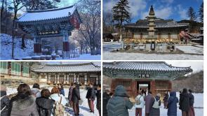 - [포교사단] - 일시 : 2025년 2월 22일(토) - 장소 : 법주사 - 참여인원 : 교육생 28명, 교수님3분, 교육팀 새벽에 내린 눈으로 약간의 눈이 쌓인 법주사에서 불교문화해설사 지도자과정 2기 2차 연수를 진행했다. 오전 10시 입재식을 마친 후 바로 경내로 나가 문화재 해설 시연을 했다. 영하의 날씨와 칼바람으로 체감온도는 더욱 내려 갔지만 묵언과 사찰예절을 준수하는 가운데 열공 열의를 더하여 과정을 진행해 갔다. 참여한 연수생님들 남은 연수기간동안 모두 화이팅!