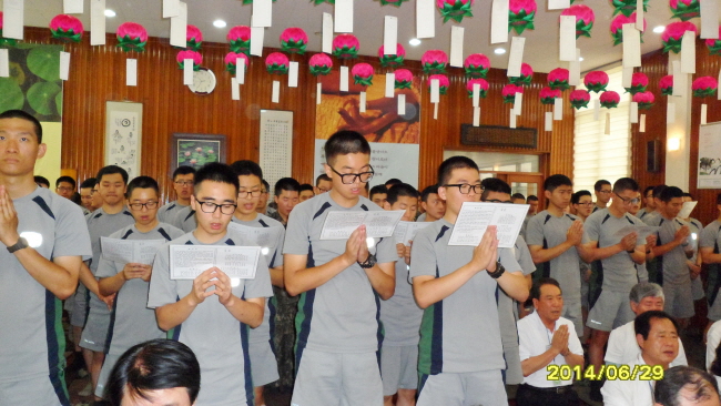 불기2558년 (2014) 6월29일 일요일 오전10시 경기도 파주 소재 9사단 상승사에서 포교사고시 제19회 1차 합격자 (서울지역단) 군포교 연수교육이 있었다. 삼귀의와 한글 반야심경으로 시작된 이날 행사는 서부 군2팀 우파 여한균팀장의 지휘아래 일사분란하게 진행되었으며 반야정 이선재 포교사의 집전과 황구연 포교사의 설법 순으로 이루어졌다. 이날 행사에는 서울지역단 법천 장봉수 부단장과 법용화 한애경 부단장. 포교지원본부 혜등 이주영 총괄팀장. 서부지역본부 자광 윤광식 총괄팀장. 우파 여한균팀장. 9조 효광 여원태 교육팀장. 10조 법공 이은갑 교육팀장. 반야정 이선재 포교사. 조용우 포교사. 김지아 포교사가 참석하였다. 특히 이 날 법회에는 19회 1차 합격자 군포교 연수교육의 마지막날로 20명의 1차 합격자와 110여명의 평소보다 많은 군장병이 자리를 함께 하였으며 19회 1차 합격자들은 군장병들의 법회순서와 설법의 자세 그리고 진행과정등을 시종 진지한 분위기속에 차분한 자세로 연수교육에 임했다. 사진촬영 / 혜등 이주영 취재 / 홍보팀 법용화 한애경