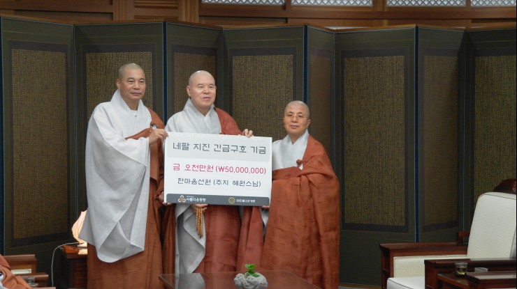 총무원장 자승스님은 “구호기금을 모으느라 고생했다”고 노고를 치하하며 “아름다운동행과 논의해서 지진피해를 입은 네팔을 복구하기 위한 지원금으로 잘 쓰겠다”고 화답했다.