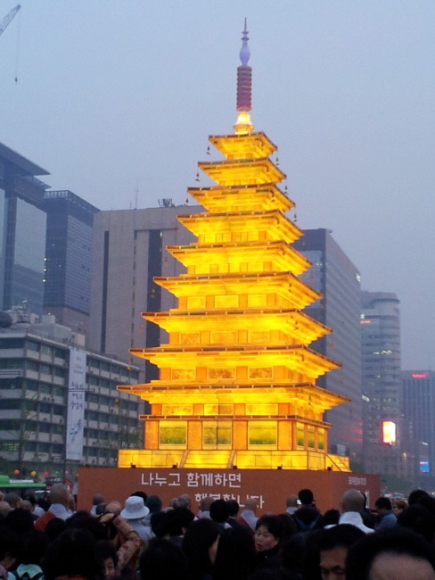 - [서울] 서울 광화문 광장 "미륵사지 탑등 점등' "나누고 함께하면 행복 합니다" 불기2558년 부처님오신날 봉축위원회(위원장 자승스님)는 연등회의 시작을 알리는 봉축 탑 점등식을 4월16일 수요일 오후 7시 광화문 광장에서 봉행했다. 지난해부터 광화문 광장에서 봉행하고 있는 점등식에는 봉축위원장 자승스님, 호계원장 일면스님, 교육원장 현응스님, 포교원장 지원스님, 조계사주지 도문스님, 천태종 총무원장 춘광스님, 진각종 통리원장 회정정사, 태고종 총무원장 도산스님, 관음종 총무원장 홍파스님, 이기흥 조계종 중앙신도회장, 서울시 행정부시장, 곽명희 포교사 단장 등 사부대중 1,500여 명이 참석해 등불을 밝혔다.. 점등식은 삼귀의, 반야심경 봉독, 조계사합창단의 찬불가, 점등, 축원, 기원문, 탑돌이, 사홍서원 순으로 진행됐다. 총무원장 자승스님은, 기원문을 통해 "생명의 존엄으로 오신 부처님 가르침이 정의롭고 공정한 시민의 광장은 미래의 빛으로 맞이하고 있다"면서 "이제 오늘의 빛은 이곳에만 머무는 것이 아니라 온 세상의 어둠을 온 인류의 마음을 비추게 될 것" 이라고 말했다. 올해 봉축표어로 "나누고 함께하면 행복 합니다"는 "동체대비의 사회적 실천과 자비나눔으로 부처님의 가르침을 전하고 따뜻한 세상을 만드는데 노력하자는 의미를 담고 있다고 밝혔다. 또한 스님은,"부처님 법을 만난 소중한 인연 공덕으로 오늘 우리가 밝힌 등불을 모든 이들의 마음을 담아 공업중생의 공동체를 위하여 세상을 맑게 하는 불제자가 되길 바란다"고 말했다. 이어 "오늘 진도 앞바다에서 안타까운 사고가 있었는데 모두 무사 구조되길 간절히 바란다"라고 기원했다. 참가자들은 서원 등을 들고 봉축 등 주위를 돌며 나라, 가족 진도 여객기 희생자를 애도하는 탑돌이를 끝으로 점등식을 회향했다. 이날 포교사들은 점등식 1시간 전부터 집결해 참가자들의 안전과 질서유지에 전력을 다 했다. 전영일 조형작가에 의해 재현된 '미륵사지 탑등'은 국보 제11호 익산 미륵사지 탑을 형상화 한 것으로 좌대를 포함해 높이가 20m에 이른다. 미륵사지석탑의 70%크기로 전통한지의 은은하고 화려함을 살려 40호 크기의 한지 500여 장으로 장엄했다. 5월6일 까지 서울 광장을 밝힐 탑등 점등과 함께 종로 청계천 등 서울시내 설치된 5만여 개의 가로연등도 일제히 불을 밝혔다. 취재 / 홍보팀 수연성 송수옥