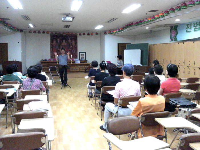 - [서울] 불기2555년 8월 26일 포교사단 교육관에서는 ‘우리도부처님같이’, ‘귀의하옵고’, ‘새로나게하옵소서’ 등의 합창 소리가 지하강당을 꽉 채우며 울려퍼졌다. 서울포교사단 합창단이 매주 금요일 14시 합창을 연습하는 장면이다. 이날 단원들은 더욱 열창을 하고 있었는데, 그것은 9월 24일과 25일에 있을 팔재계수게실천대법회에서 멋진 실력을 선보이기 위해서다. 합창단의 지휘를 맡고 있는 이준형 지휘자는 현재 연합합창단서울지구위원장으로 있으면서 그곳의 지휘를 맡고 있으며, 제14기 포교사로서 열심히 포교활동에 동참하고 있다. 서울포교사단의 합창단은 군부대와 교도소, 춘천의 102보충대, 병원법당 등의 행사에 참여하고 있고, 포교활동을 하고 있는 장소에서 합창을 요청하면 언제나 달려가 음성포교를 펼치고 있다. 합창단원은 모두 30명으로 강예자 위원장과 김용희 팀장을 중심으로 열심히 활동하고 있다.