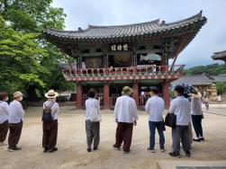 - [울산] ** 22년 7월10일 영축팀 활동 ** 7월 영축팀 활동에 27기 1차합격자 2조에서 6명이 팀연수 오셨습니다. 25기 혜림 백재효님께서 삼성반월교를 시작으로 통도사의 역사와 하로전을 설명하였습니다. 길상화 이경화님께서 범종의 설화까지 곁들여 맛깔나게 설명하였습니다. 무량지 박광희팀장님께서 목조수통과 지역세(한지)타파에 힘쓴 덕암당 혜경스님에 대하여 설명하였습니다. 혜림님께서 하로전 마무리를 해주셨습니다. 불이문의 중보를 받들고 있는 동물형상가구의 상징성 해설 중로전 설명중 1차합격자분들께서 질문이 많아서 구석구석 상세히 벽화의 호작도까지 설명 대웅전 4면의 편액과 지붕의 철기와와 백자연봉을 상세히 설명해 주었습니다. 반야용선의 선두 구룡지와 산령각, 삼성각과 상로전의 전각들을 설명 사찰해설 요청을 받고 법우 김좌현님께서 용화전과 전법구인 봉발탑 해설 성지혜 박영례님께서 자장율사의 진영을 모신 해장보각과 솟을삼문의 개산조당 편액을 설명 백중기도 2재날이라 사찰공양이 여의치 않아서 산문밖에서 늦은 점심공양을 마무리로 연수일정을 마쳤습니다. 습도가 높은 무더운날 1차합격자분들과 사찰해설 하신 팀원 모두 수고 하셨습니다. 글: 현응심/김정애/25기